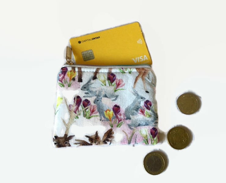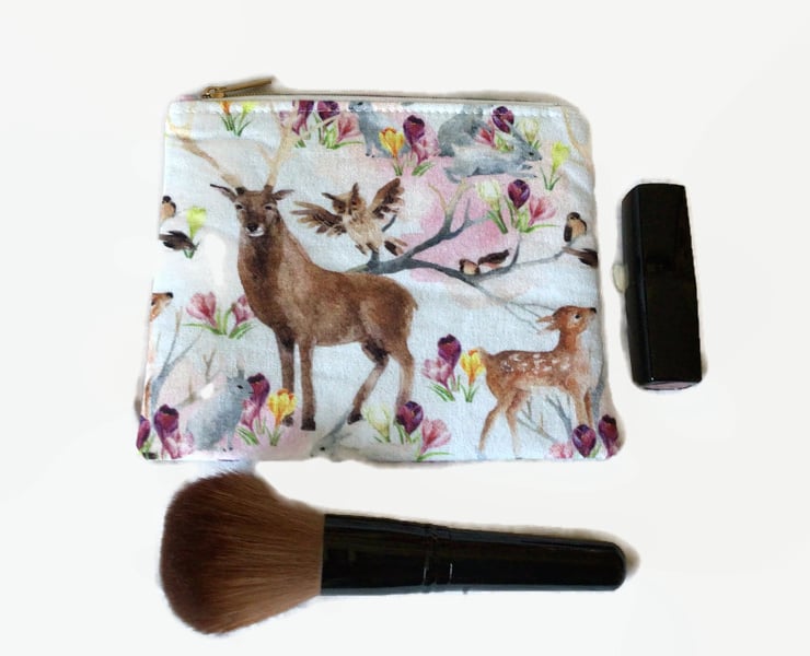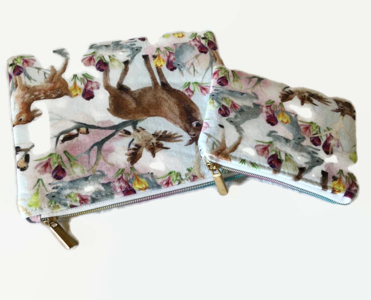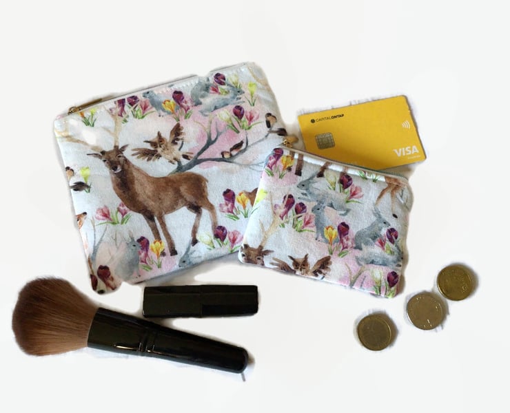 A set of two zipper pouches which may be used for make up, coins, credit cards, personal items, ear buds or anything you wish to keep safely together. These pouches are made from a woodland animal fabric with a pretty floral background with a wipeable nylon lining. These pouches also has an attractive rainbow zip. These pouches are washable at 30 degrees with a light iron.