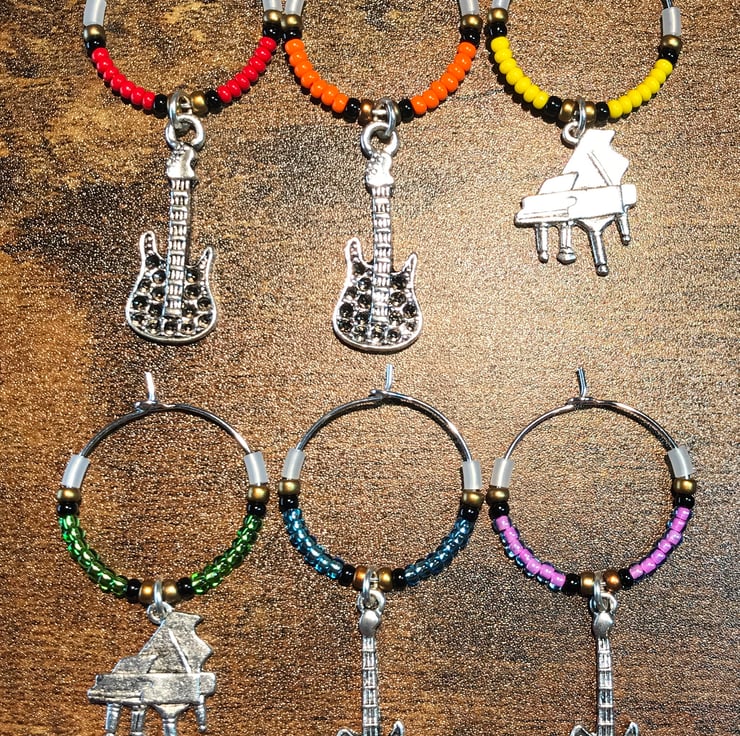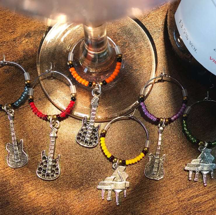 Set of six seed beaded wine glass markers with musical instrument silver charms.
