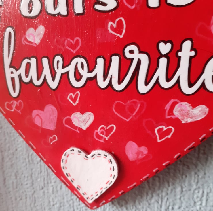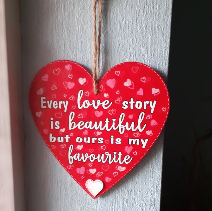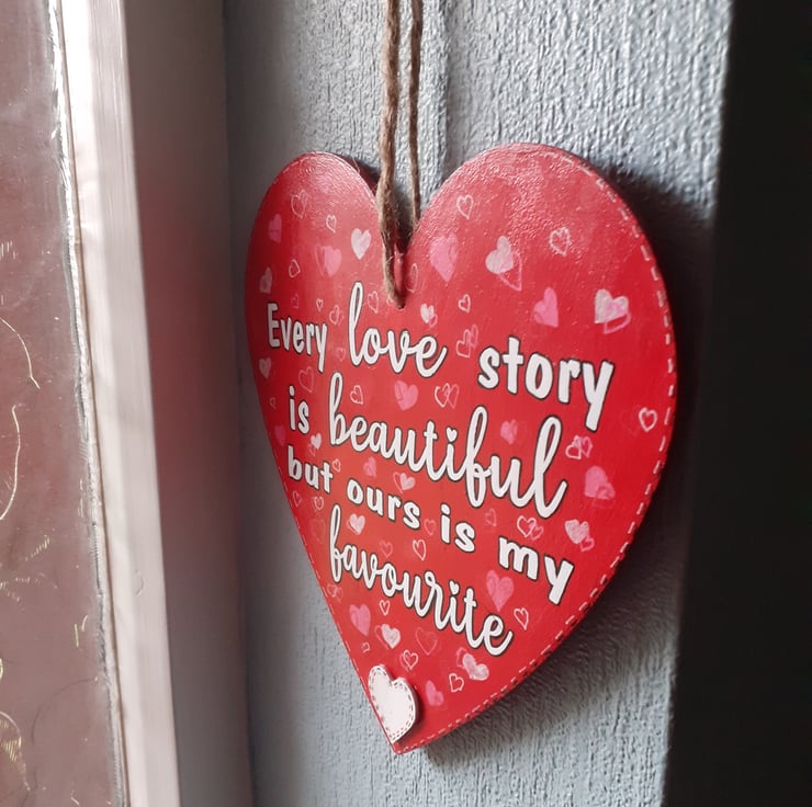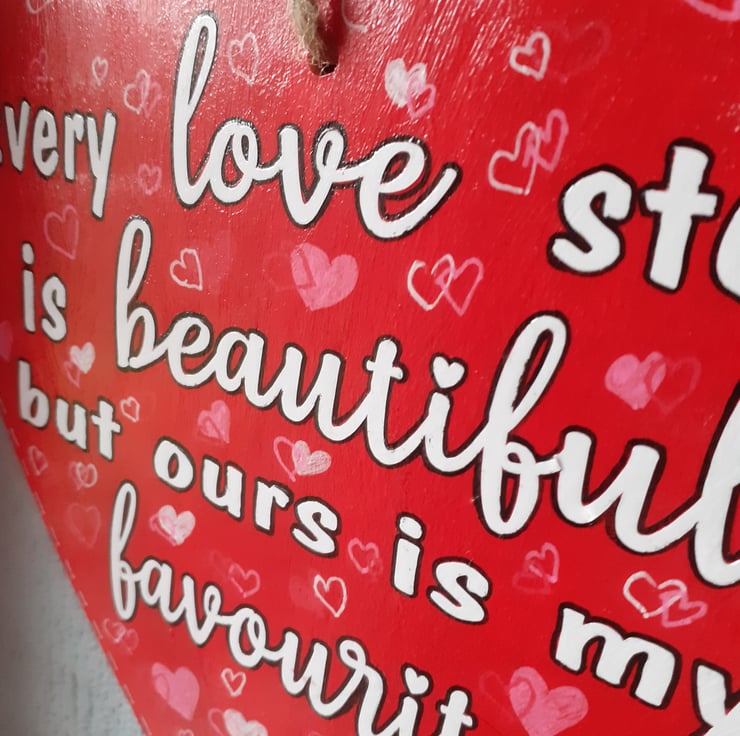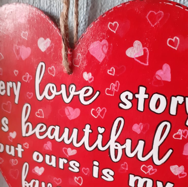 Wooden heart with sentiment - Every Love story is beautiful but ours is my favourite.