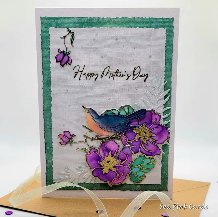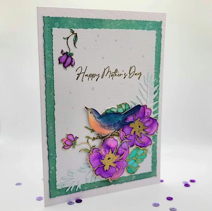 A beautifully detailed, individually handmade and watercoloured card for Mother's Day. The card measures 12.5 x 17.5 cm and has a dimensional scene of a bird, foliage and anemone flowers in rich jewel colours of emerald, amethyst and sapphire blue. The flowers are stamped, heat embossed in gold and hand-painted. Some are popped up on slim foam for a little 3D dimension. The bird has been die cut and ink blended by hand and HAPPY MOTHER'S DAY is in gold on the front. There are small splashes of sparkly ink on the white background.