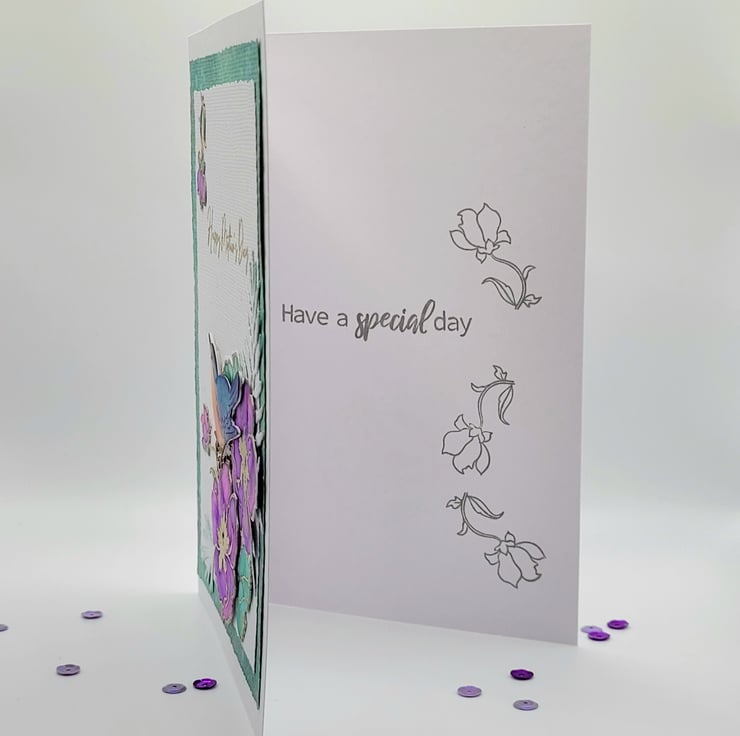 The inside is also decorated and has a sentiment stamped in grey ink HAVE A SPECIAL DAY and stamped images of flower buds.