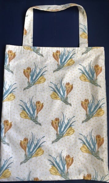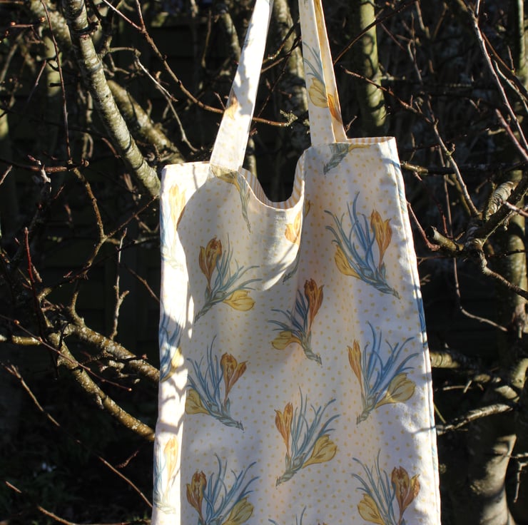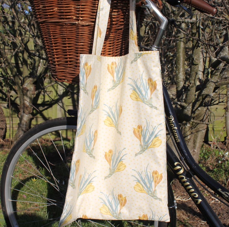 Perfect for Spring, this gorgeous floral shopping bag is made from a remnant of vintage Colefax and Fowler cotton chintz fabric featuring yellow crocuses on a background of tiny yellow trefoil leaves. It is lined with co-ordinating yellow ticking stripe cotton fabric. The fabric is unused but quite old so I have given it freshening wash!