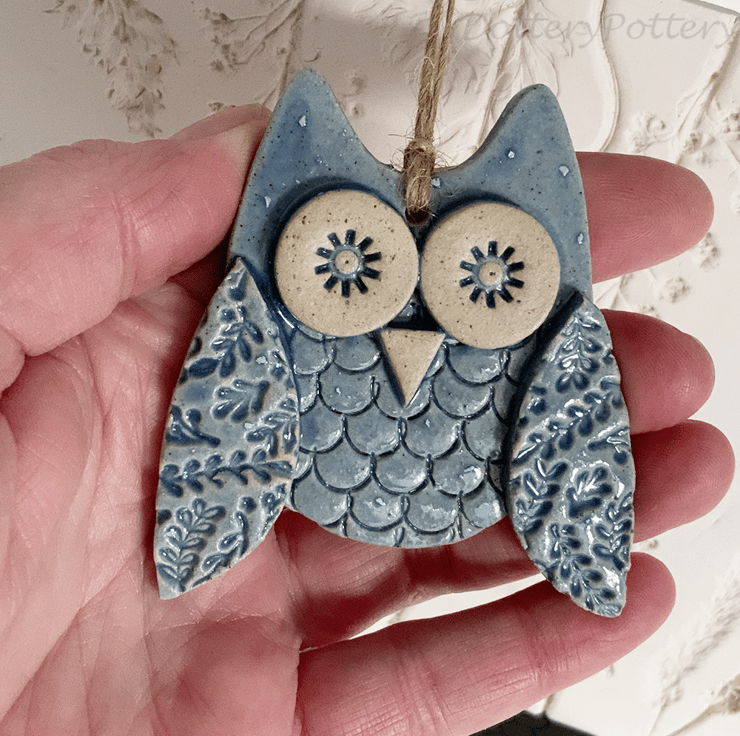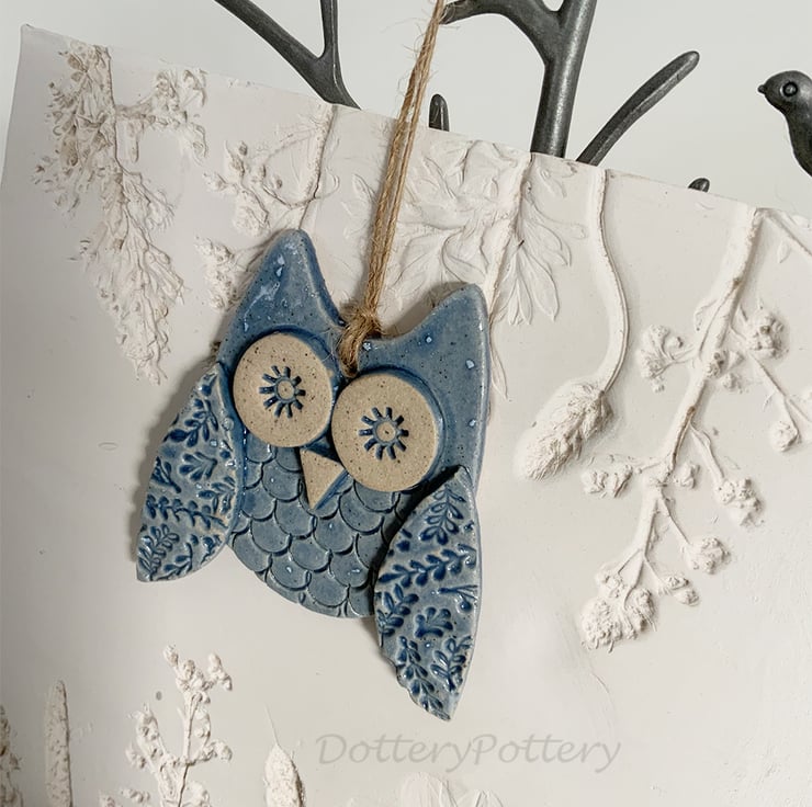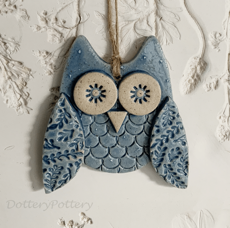 This cute little owl is made from stonware clay. Each part has been embossed with pattern and then cut from hand made templates. It has been decorated with bright, glossy glazes and finished with a matching brown string It measures 7cm high by 6cm wide by 1.5cm deep. Glazed on the front, plain clay colour on the back. This one is a special reduced price because there are some lumps in the glaze as shown in photo.