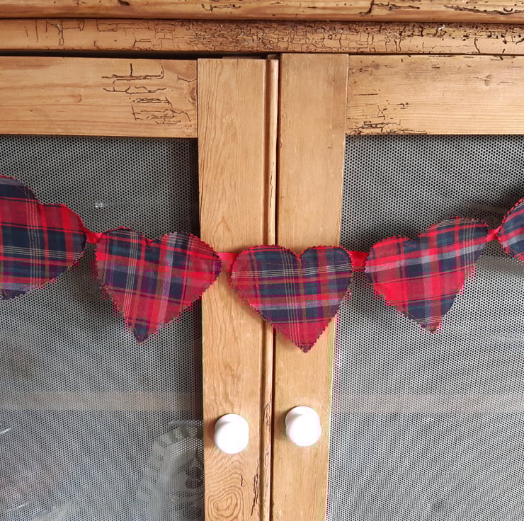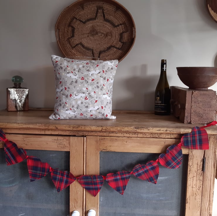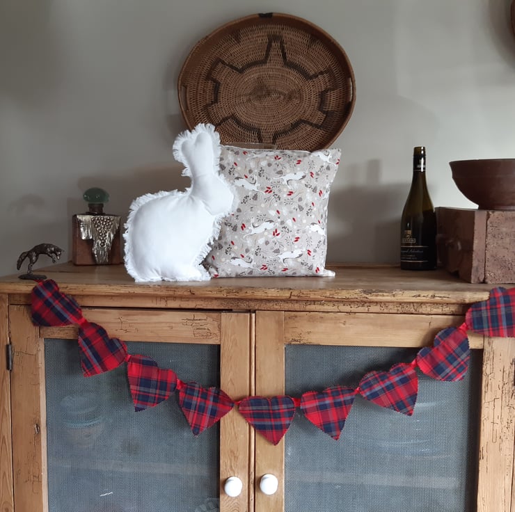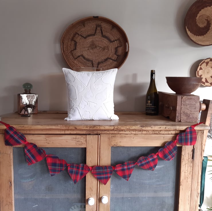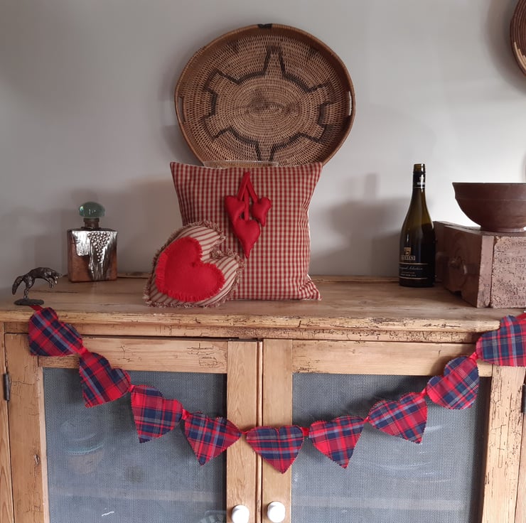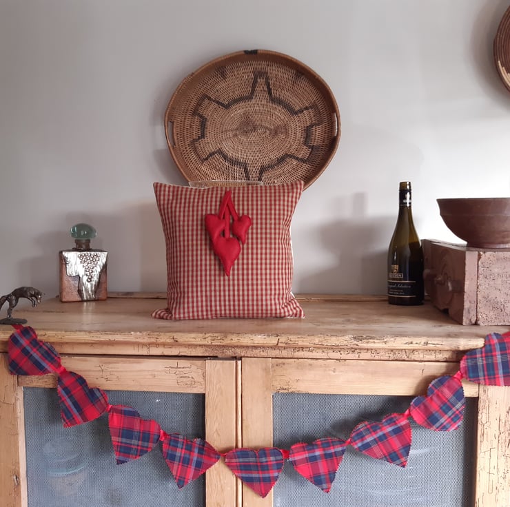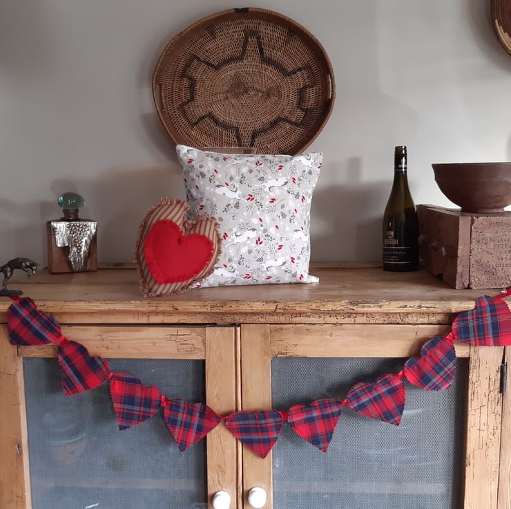 This delighted tartan bunting in red hues is a perfect decoration for anyone who loves giving heart decorations or who love hearts themselves. Made using cotton both front and back and sewn on to a strong ribbon. As you can see from the photos, this bunting matches up with many designs and colours of cushions and is a beautiful gift.
