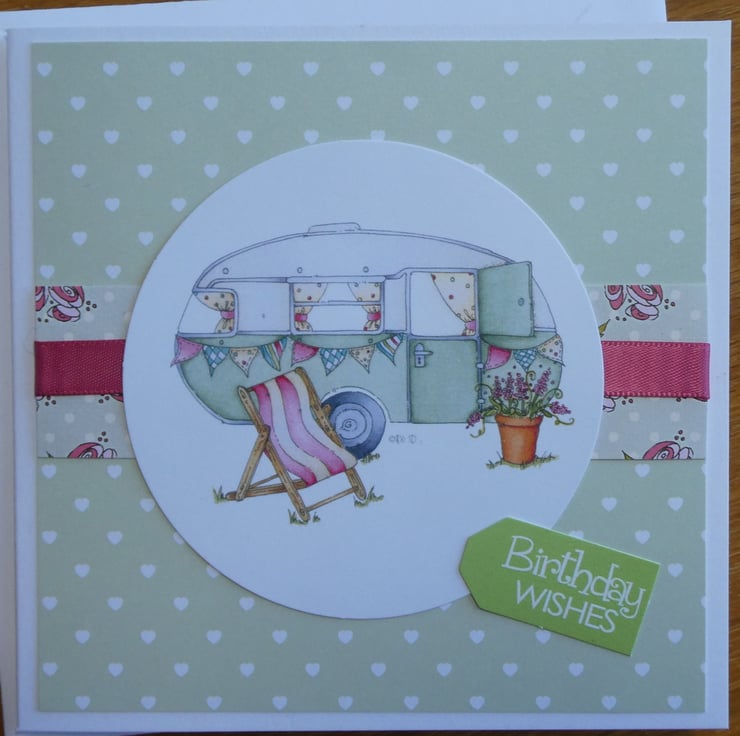 This birthday card has a printed topper showing an old style green and white caravan with pink and green bunting and a pink and cream deck chair.