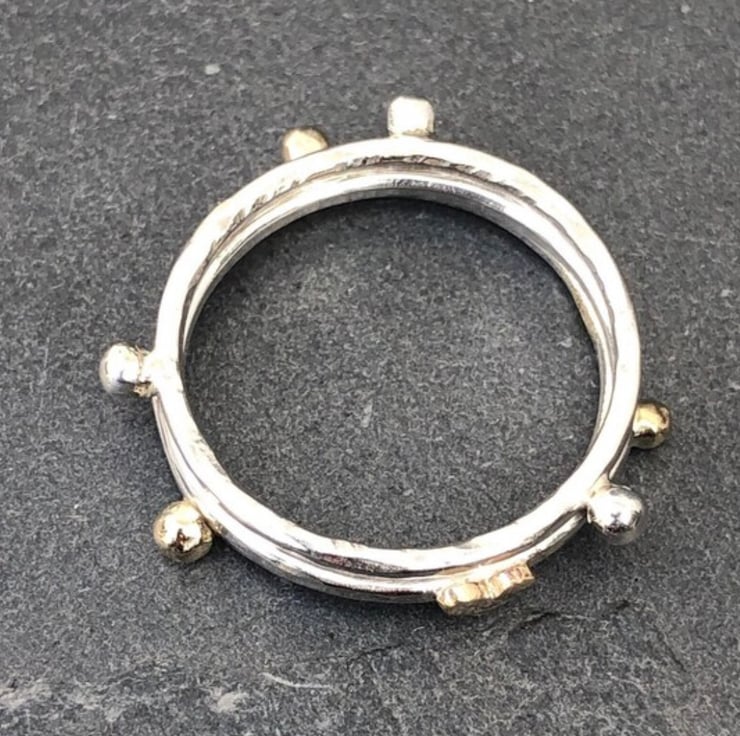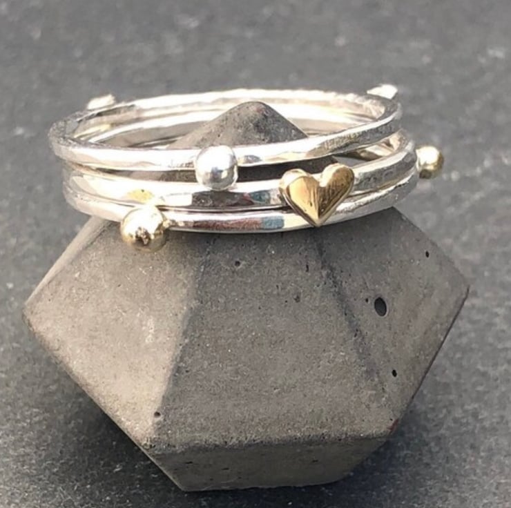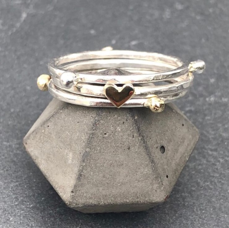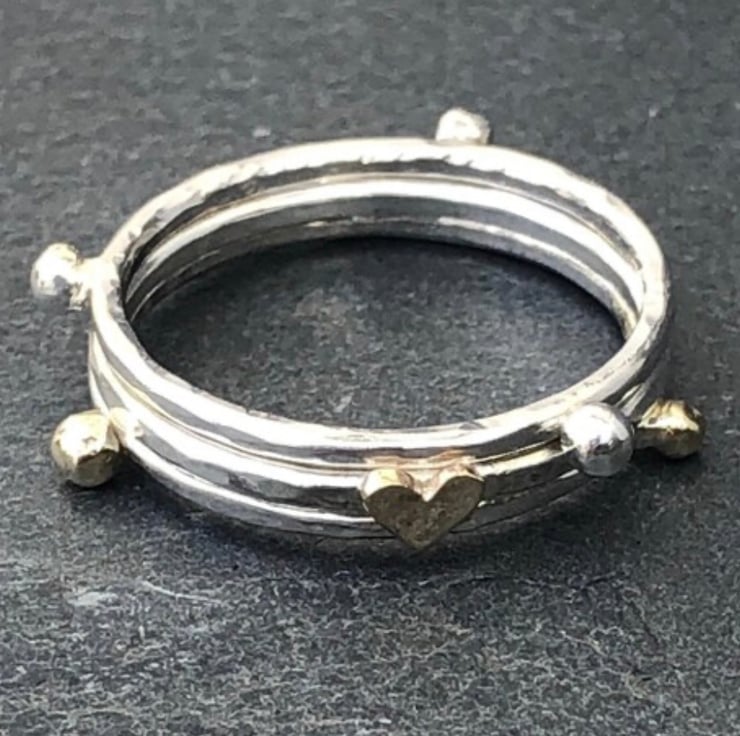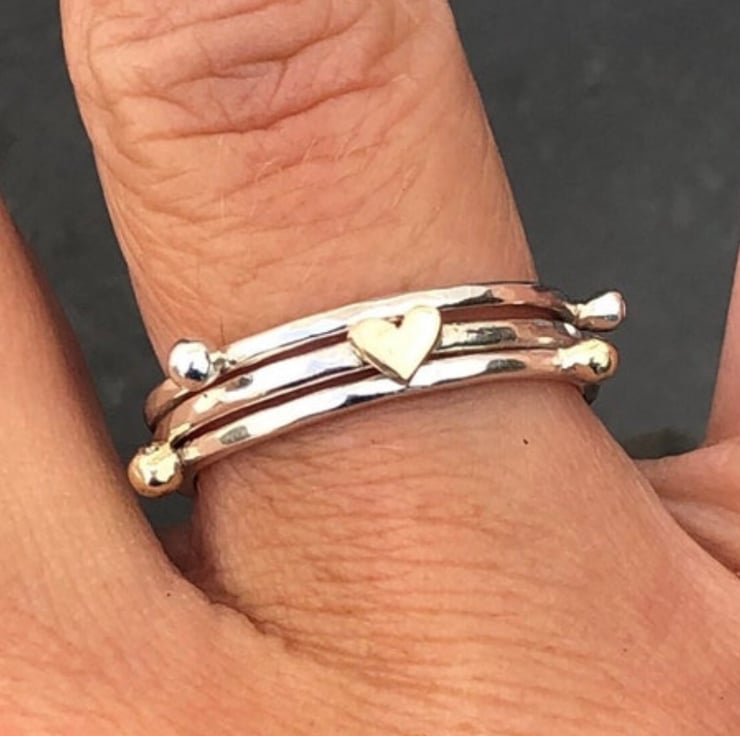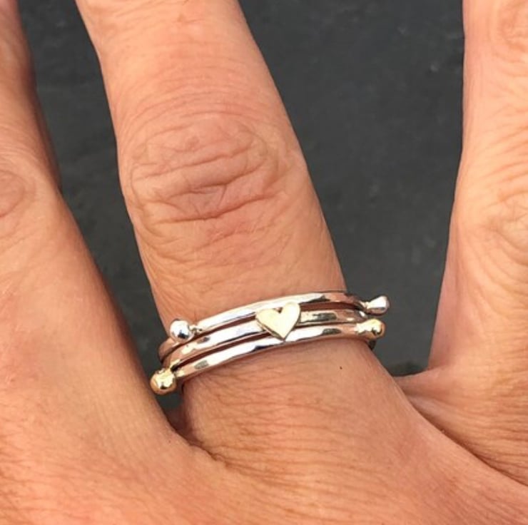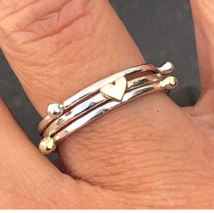 This Gold heart Sterling Silver Stack ring is made up of three delightful rings. The middle one is a hammer textured silver band which features a 9ct gold heart and the two outside hammered rings which feature fine silver and gold ball detail.