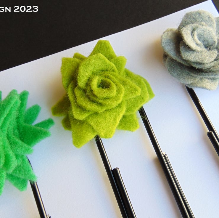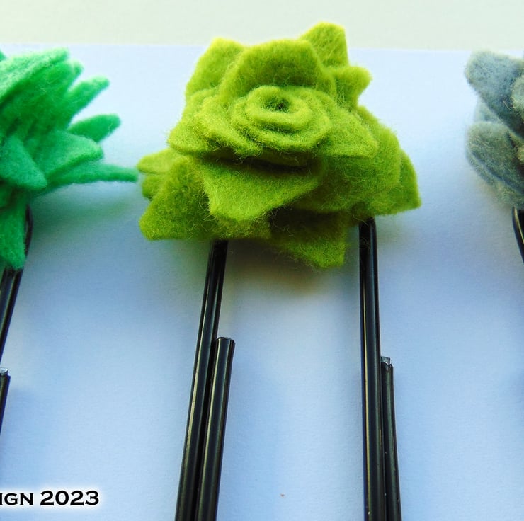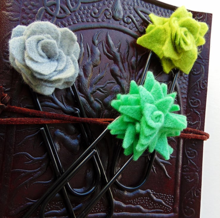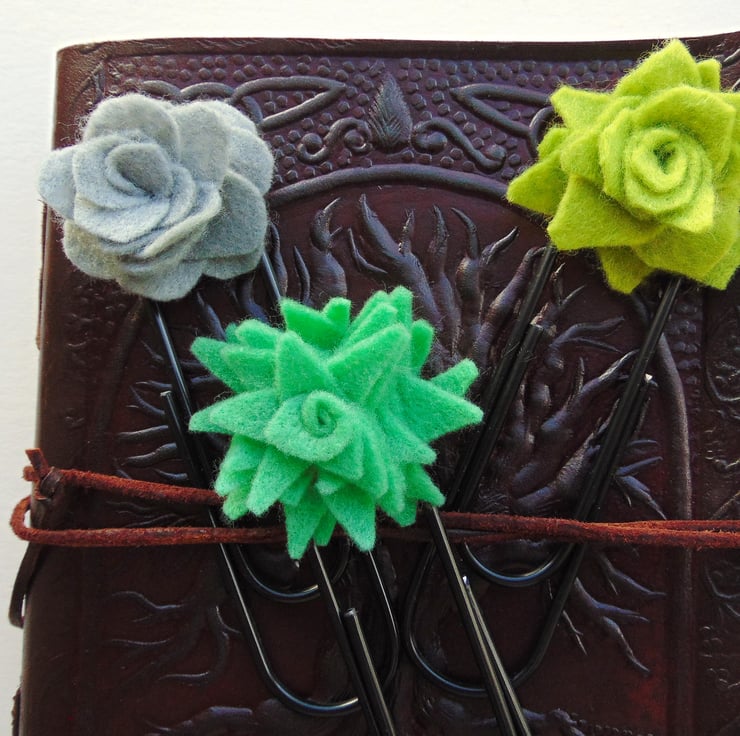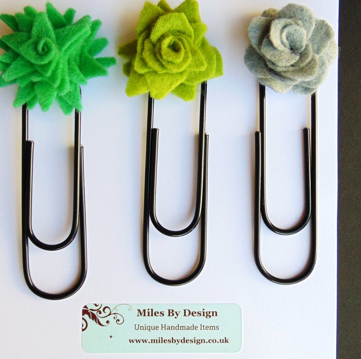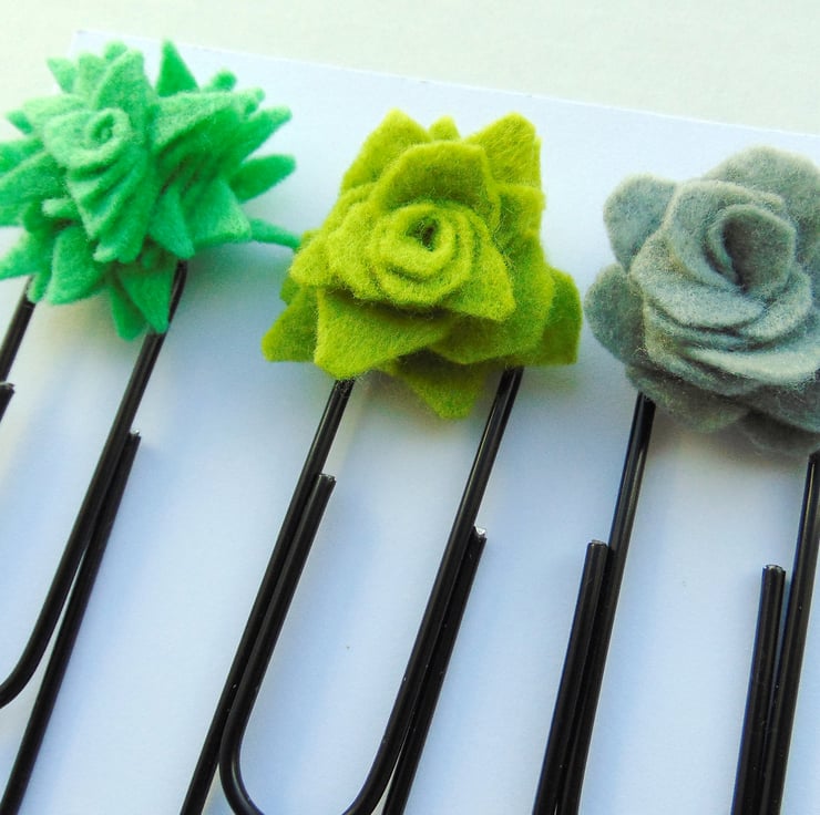 A nice addition to the usual boring office stationary. These three large metal paper clips have been topped with handmade felt succulents securely sewn on to the top of each one.