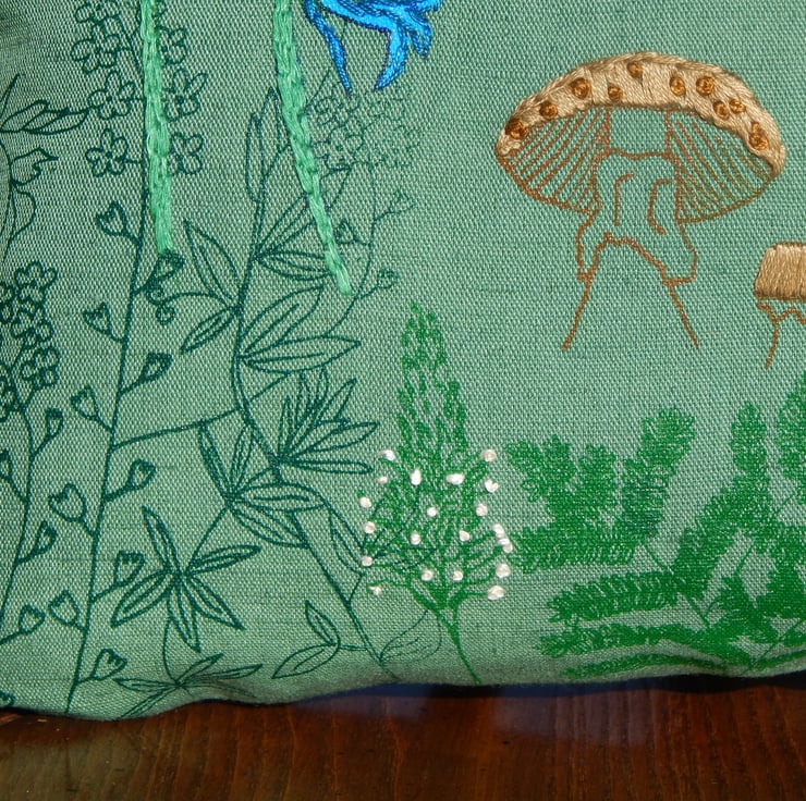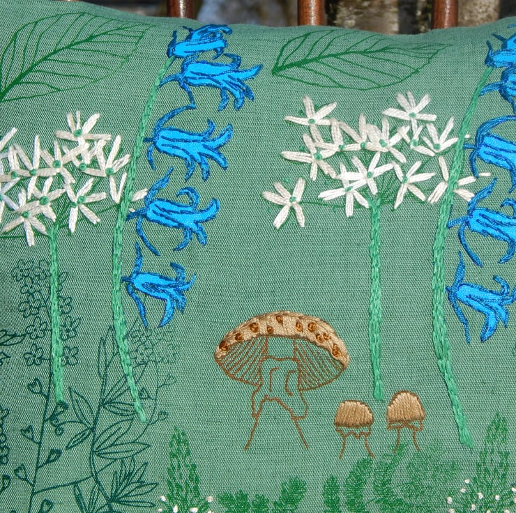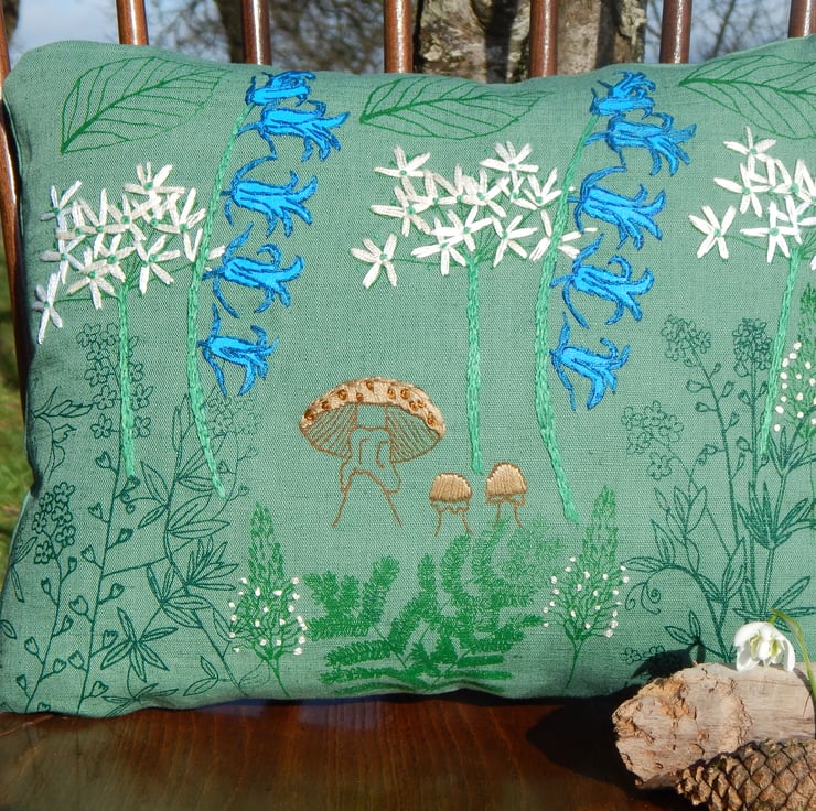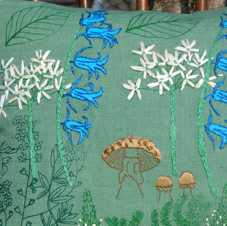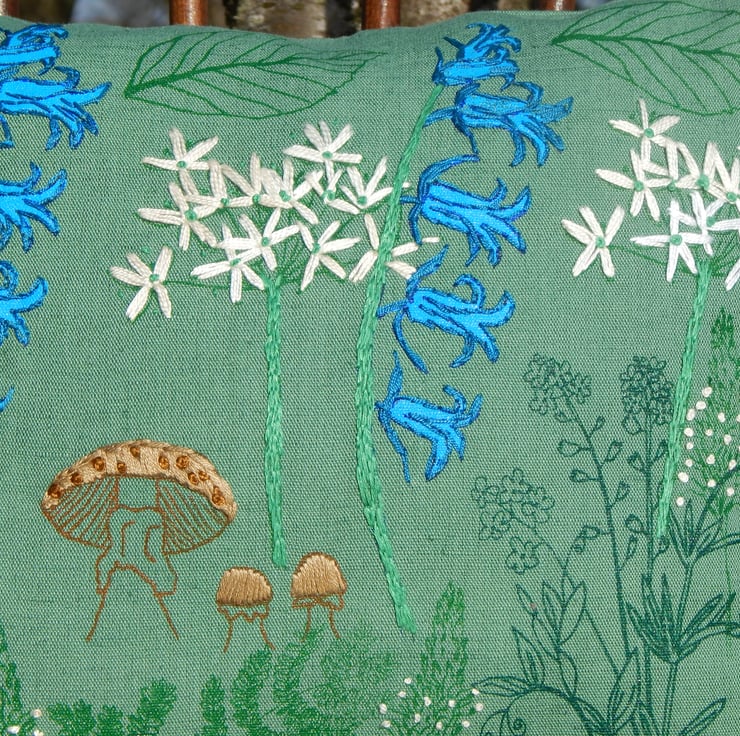This is a green medium weight linen cushion that has been screen printed with my own designs. There is a background design of forget me nots, beech leaves and bracken. There are then wild garlic, bluebells,plantain and fungi which have all been printed individually and hand embroidered to make them pop with texture and colour.
