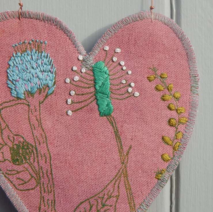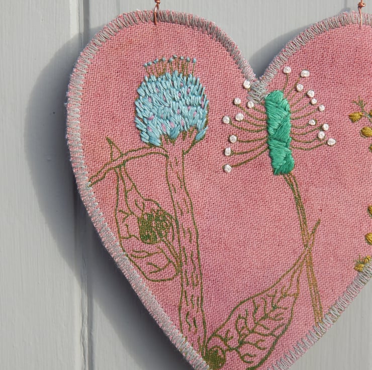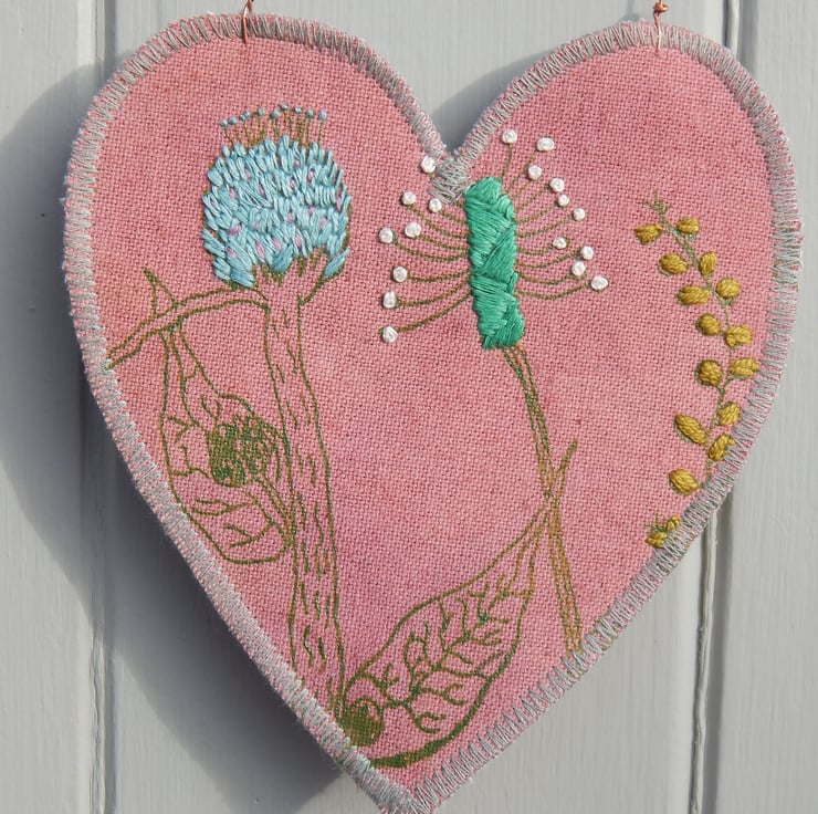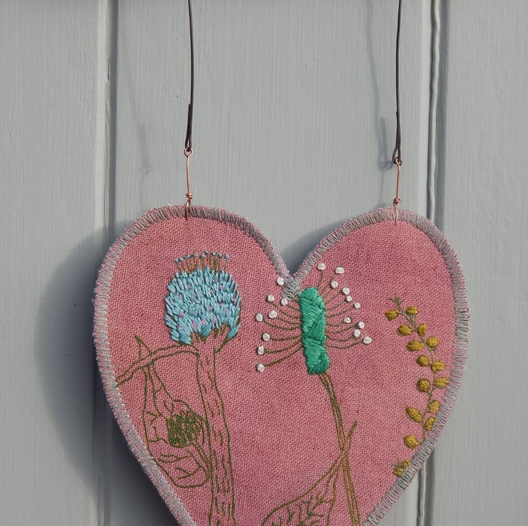 This is a naturally dyed hanging heart, using sloe for a dusky pink colour. The heart is hanging on a piece of willow using wire and simple metal fixings. The heart has a dock leaf, thistle family and plantain screen printed with hand embroidery for a pop of colour and texture. The heart measures approximately 15cm by 15cm at the widest and longest parts. The heart has some interfacing and is backed with plain grey fabric for stability.