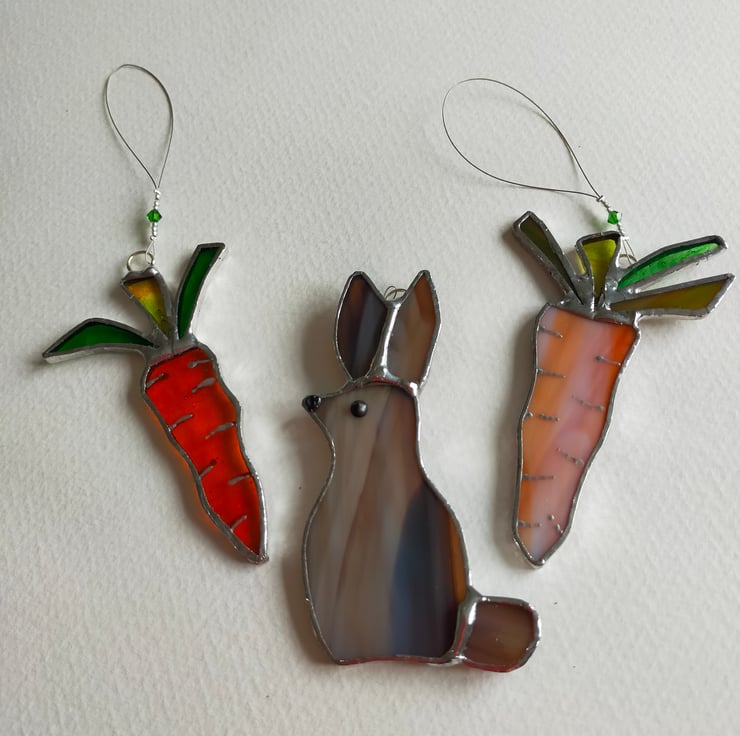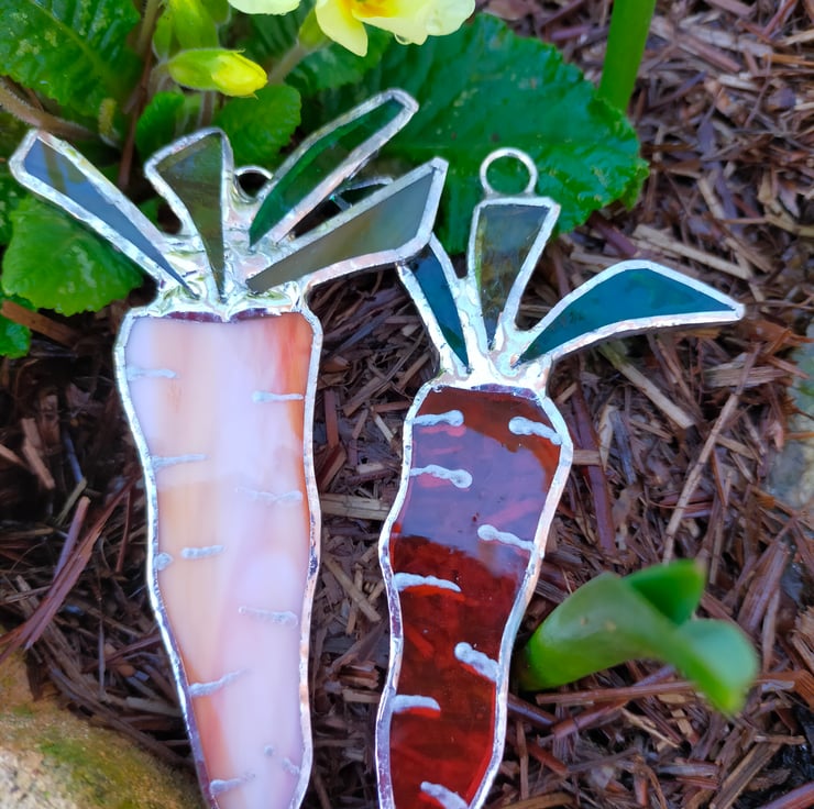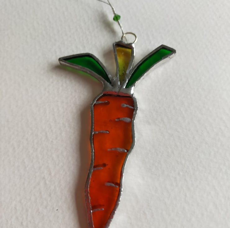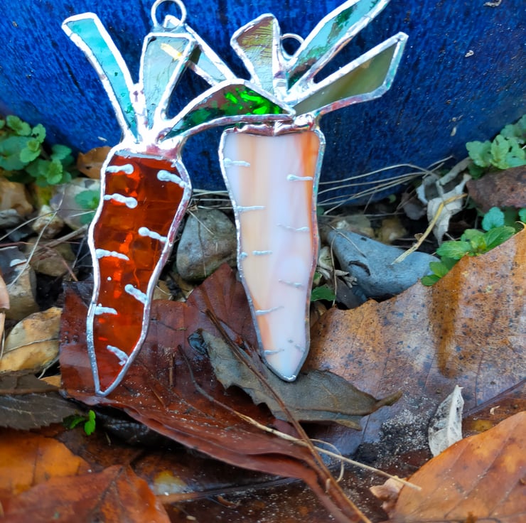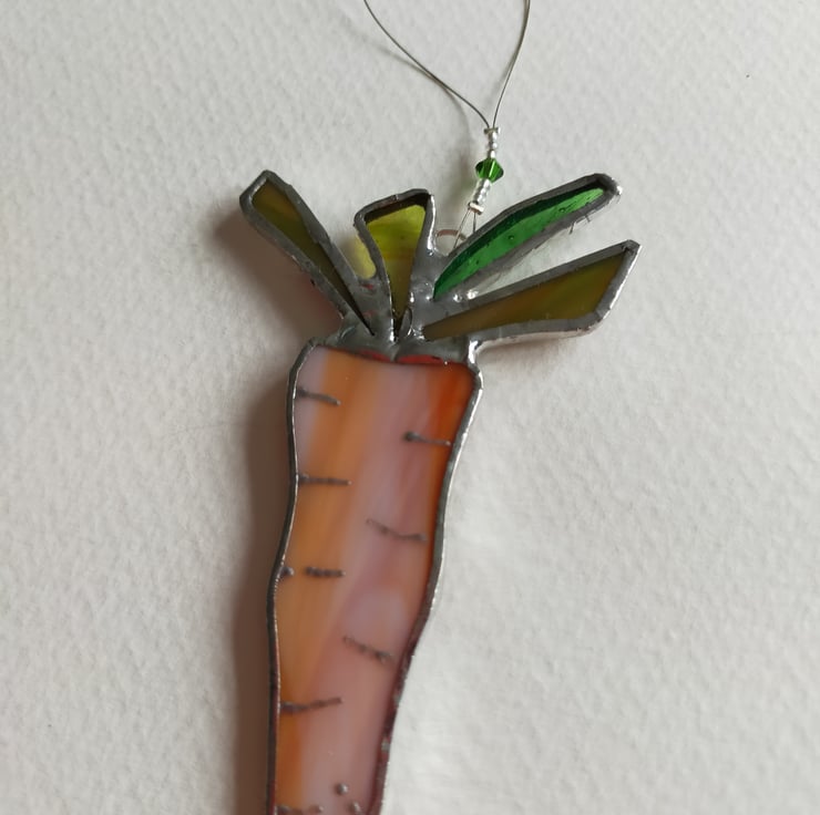 Made in the Tiffany method my glass carrot makes an attractive kitchen suncatcher or co-ordinates with my other Easter tree decorations. Approximately 3 inches or 8cm long the carrot comes in a choice of transparent or opal orange glass with a variety of green glass for the foliage.