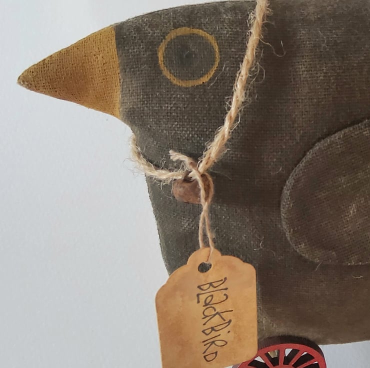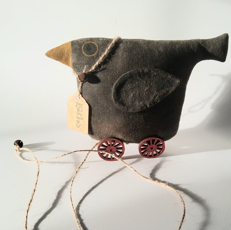 Made from acrylic painted Osnaburg fabric, given a good old sanding and then given a coffee wash for an aged look. Blackbird has wooden axles and wooden spoked wheels, he sports a rusty bell on his jute collar and also on his pull string.
