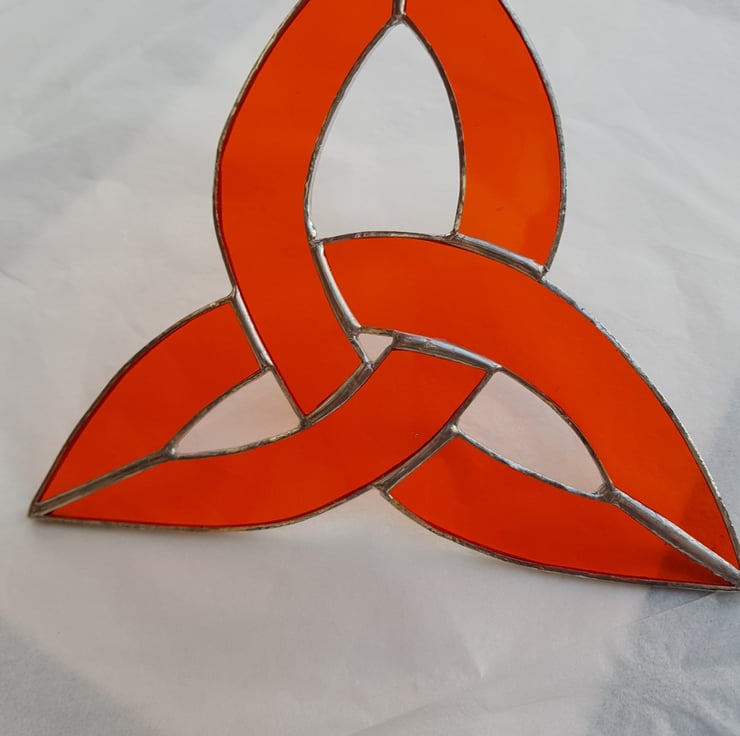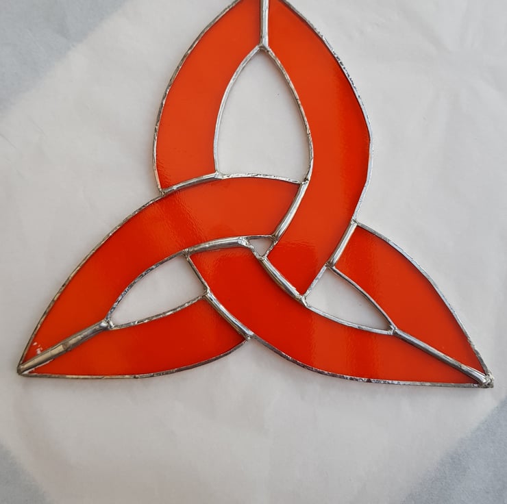 The large Celtic knot also known as a triquetra knot is made using the copper foil technique. The glass is cut to shape and then the edges are smoothed using a grinder. Copper foil is added to each piece of glass and then all soldered together.