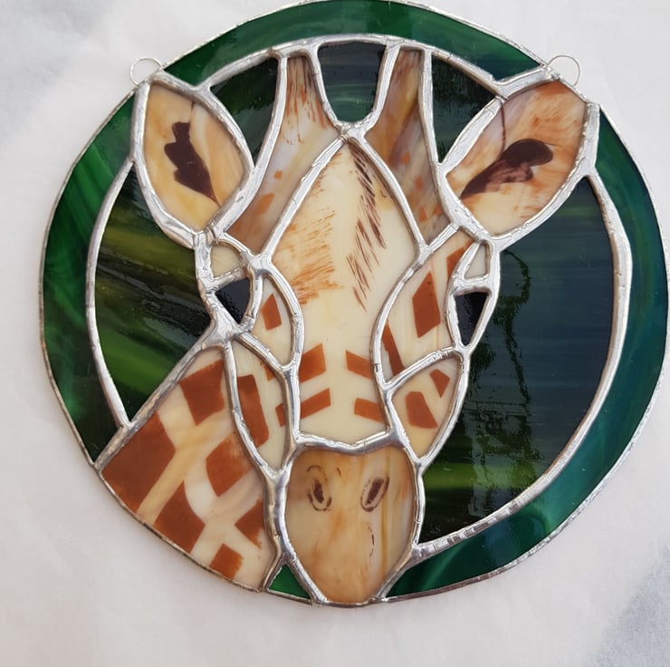 Giraffes are the tallest mammals on earth and can run as fast as 35 miles per hour. My giraffe is hand painted and the assembled using the copper foil technique. The glass is painted before firing in the kiln. this can take several firings to get the desired effect. The pieces are the ground to smooth the edges, copper foil added and the soldered together.