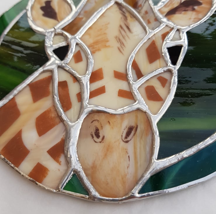 The giraffe is made with cream and shades of green glass. Brown and black glass paint. It has two rings and invisible thread to hang it with.