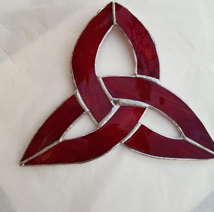 The large Celtic knot also known as a triquetra knot is made using the copper foil technique. The glass is cut to shape and then the edges are smoothed using a grinder. Copper foil is added to each piece of glass and then all soldered together.
