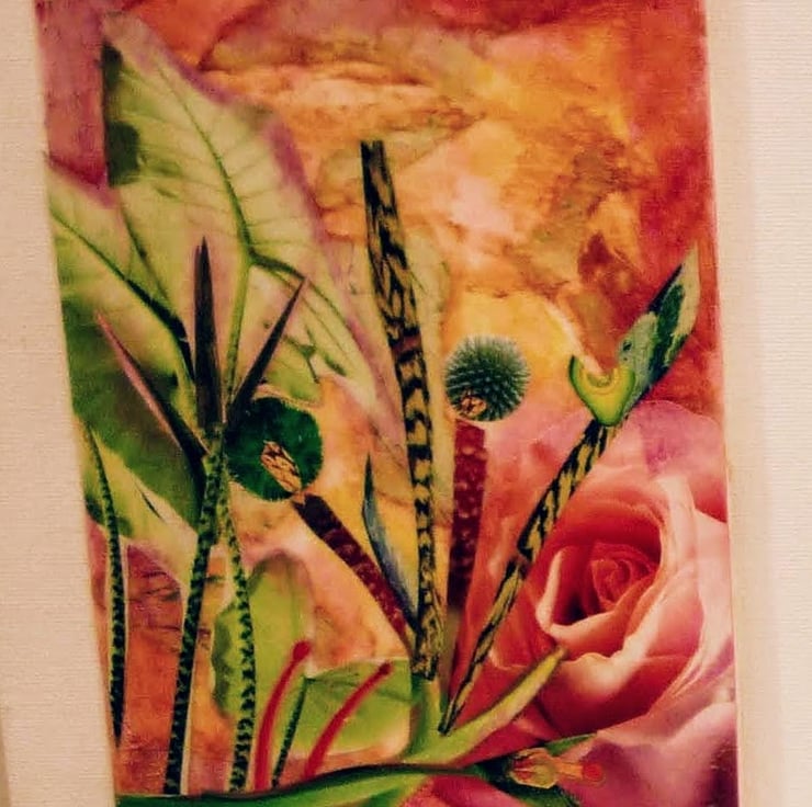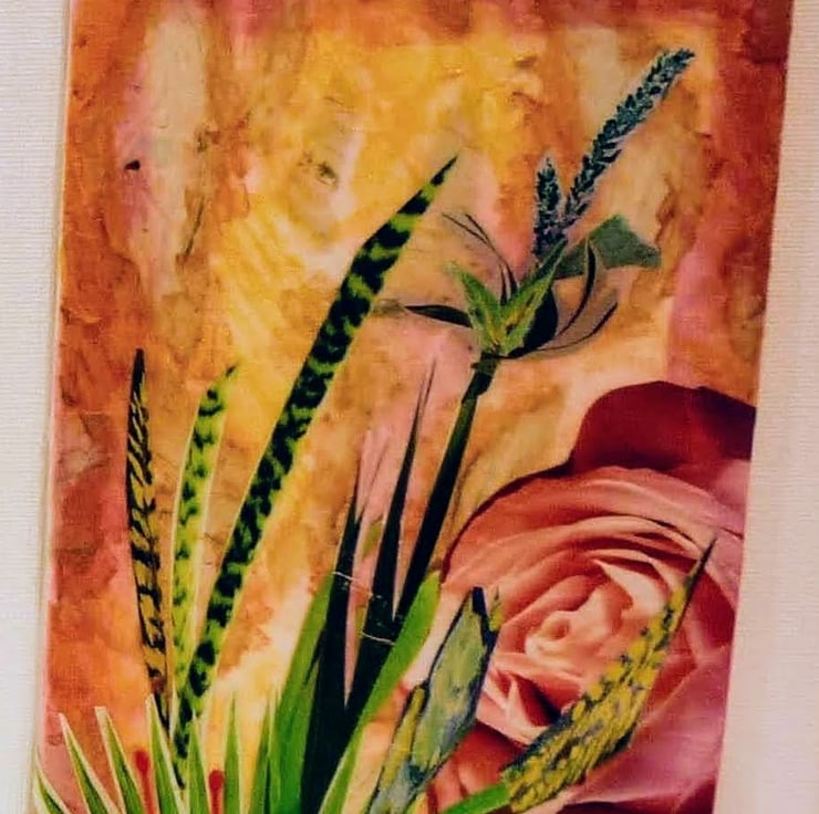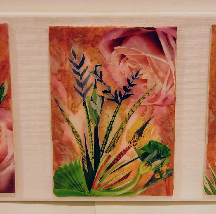 Mixed media tryptic abstract flower creation with a tropical design mixed with the traditional pink rose. Using the art of decoupage. It has a 2 dimentional appearance created using layers of fine art papers rice paper and watercolour inks.