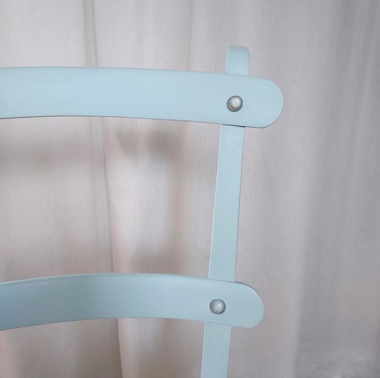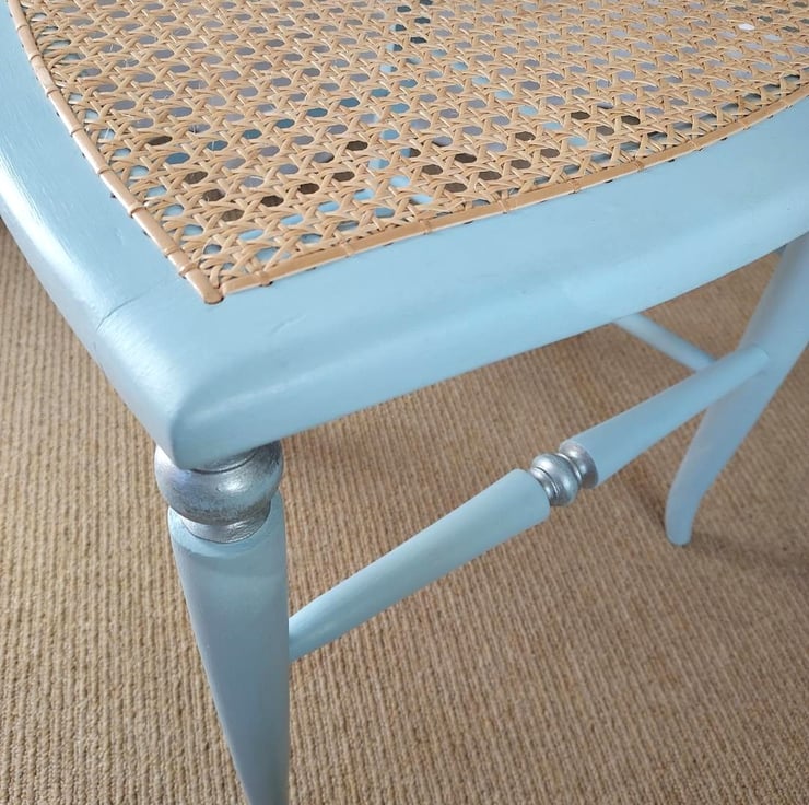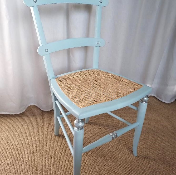 Upcycled antique chair in pale blue chalk paint, re-caned seat.