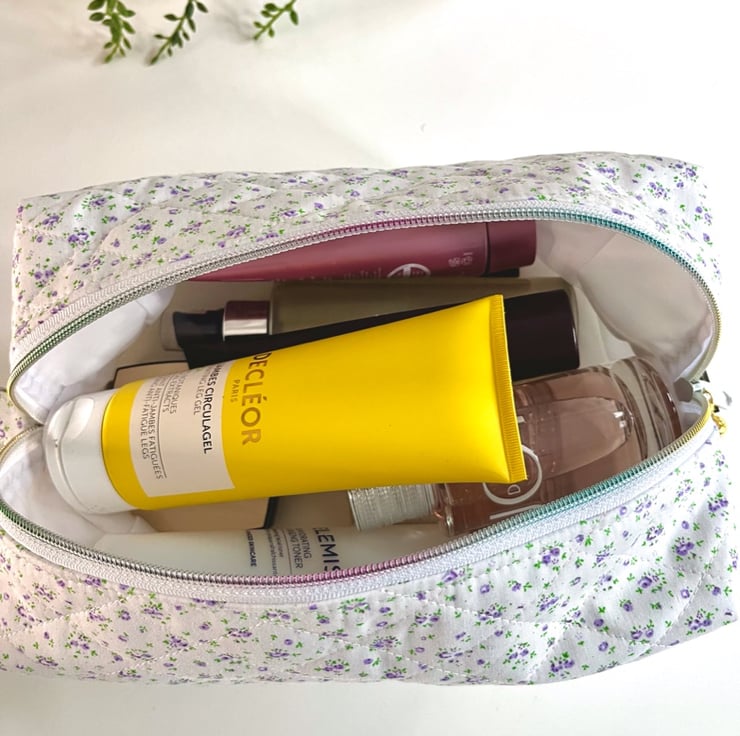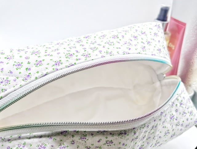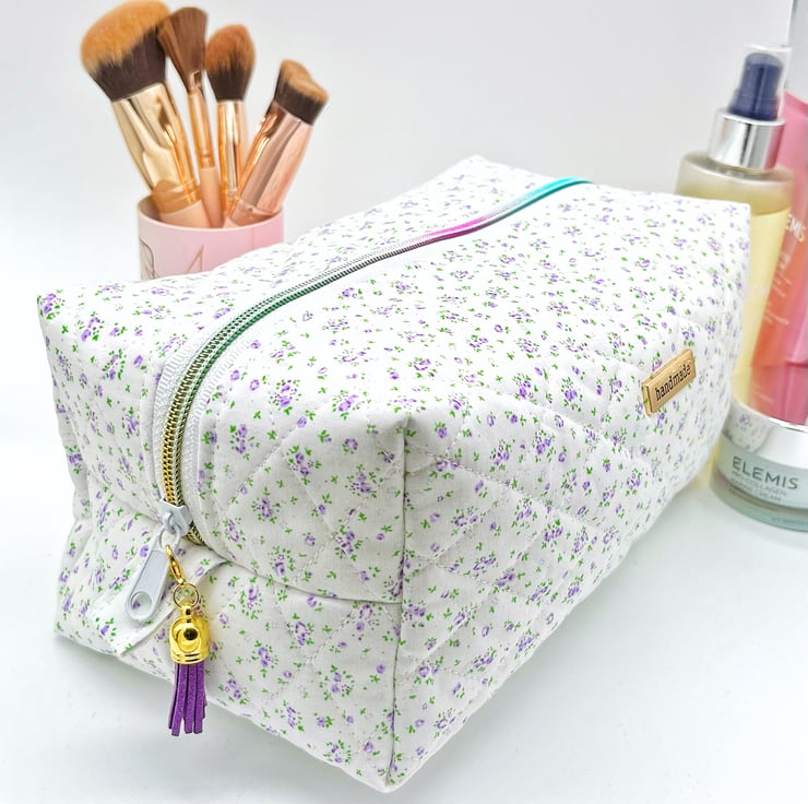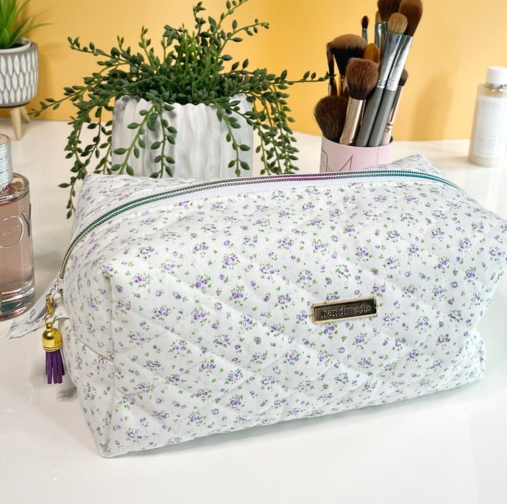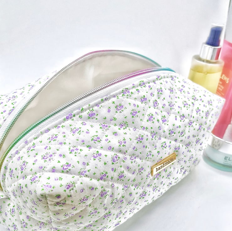 Handmade quilted makeup bag, white and lavender ditsy print cotton. Fully lined with a waterproof polyester fabric.