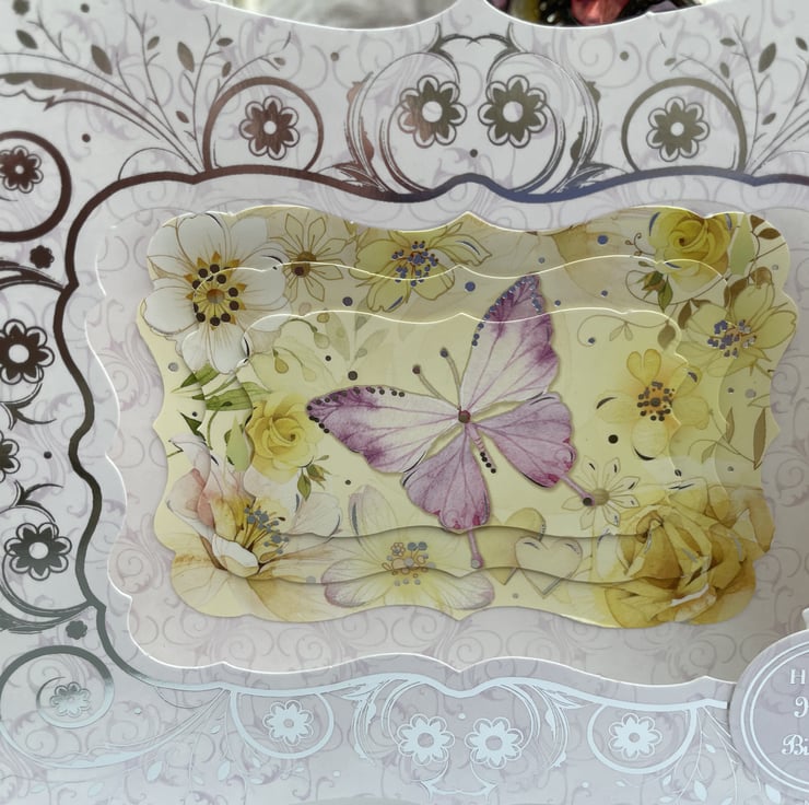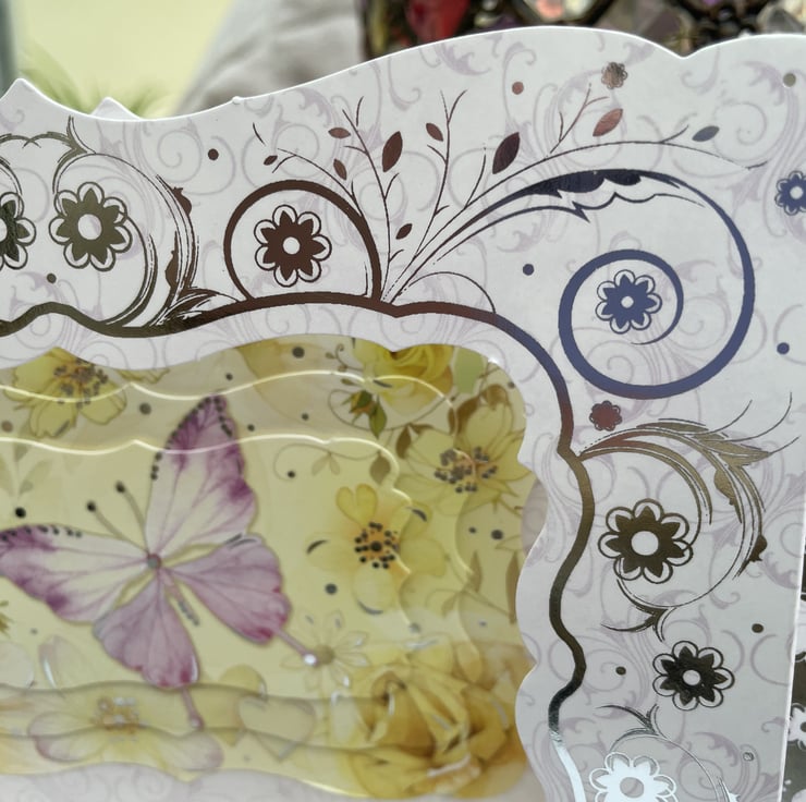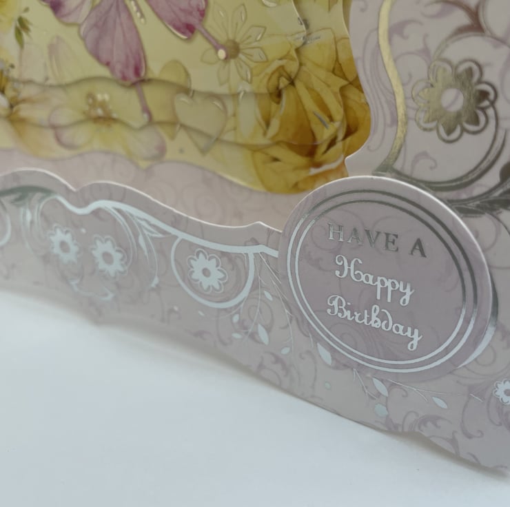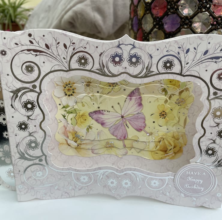 An unusual and pretty card to celebrate a birthday. This approximately A5 card is a fancy bracket shape with a layered butterfly and floral main image. The card is constructed to expand at the sides and gives the impression you are looking into the card. It expands but folds flat for posting. The outer frame is printed with silver foil flowers and swirls. the main image has a pretty pink butterfly and yellow flowers, delicate and feminine. The greeting says Have a Happy Birthday.