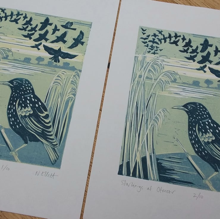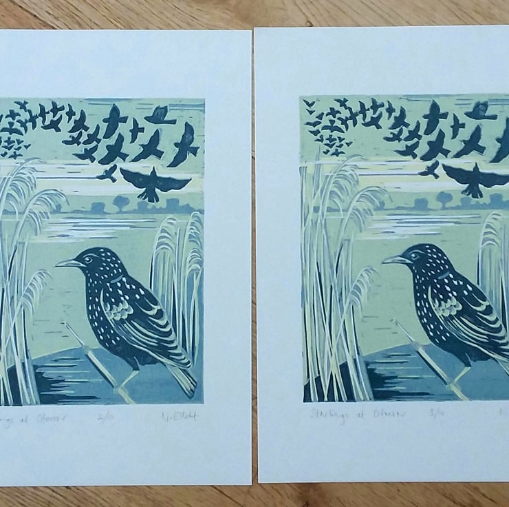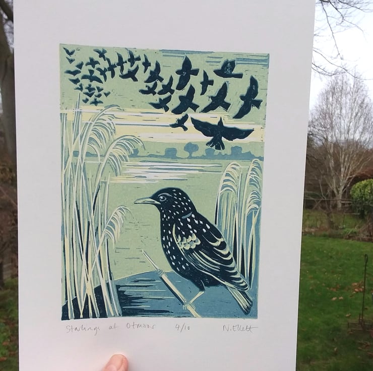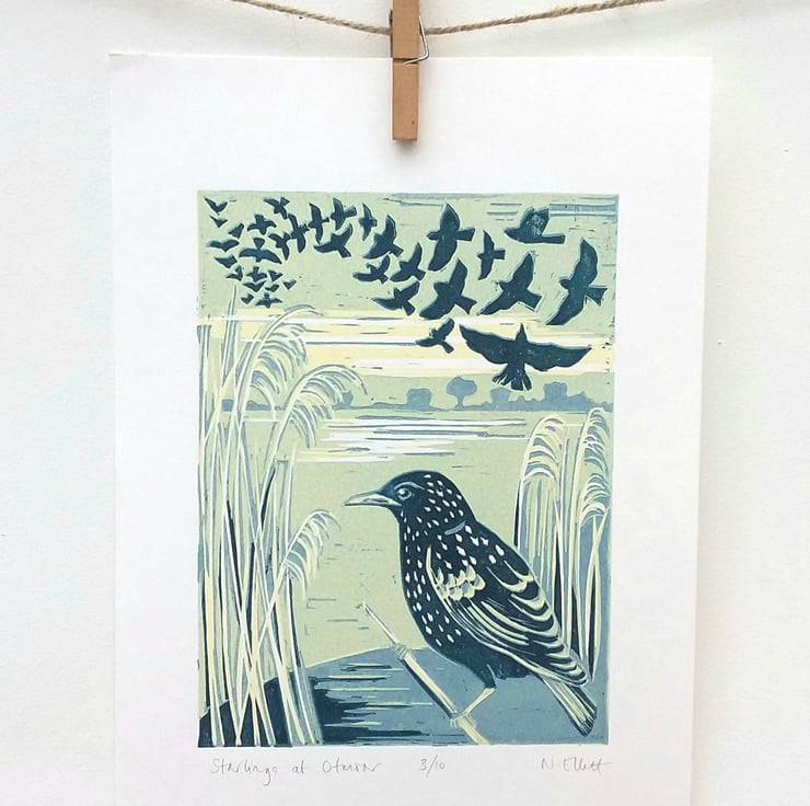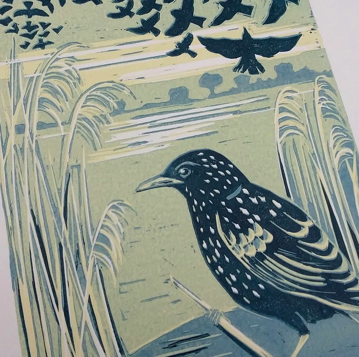 Each month last year I have made a print inspired by flowers and plants I saw around me - a great way to take notice of the changing seasons. I am continuing with a print for each month but this year I am finding inspiration in birds. During the winter months starlings gather in large numbers and swoop and dive in unison as they gather over their roosting site. Otmoor in Oxfordshire is a large RSPB managed wetland / marshland where starlings roost in the reed beds. During the winter months the starling murmerations are a magical sight to witness.