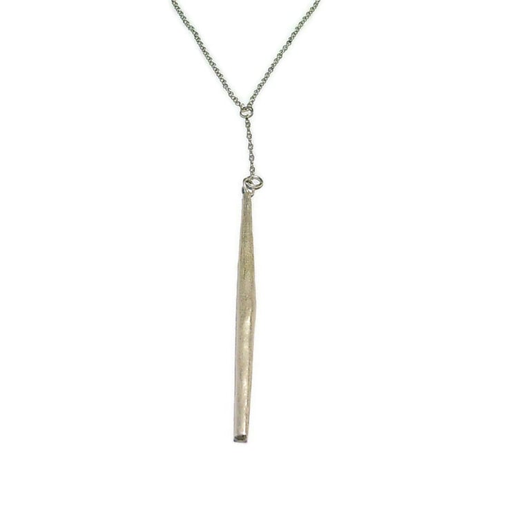 A modern minimalist but powerful pendant featuring a long tapered tube form called a spiculum, handmade from sterling silver by hammering a flat pattern cut out of sheet metal in bays of decreasing sizes until the edge meet