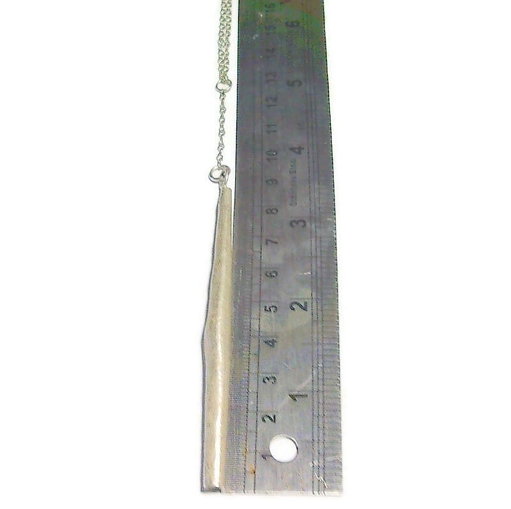 The spicuim is 9cm long and 6m wide. It hangs on a 48cm long sterling silver y necklace, chain , the drop of which is 4cm long The chain fastens with a bolt clasp