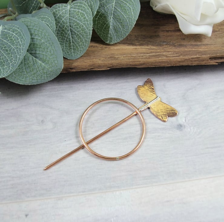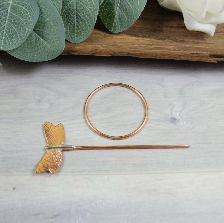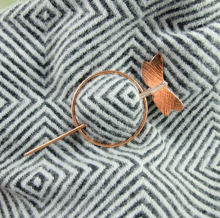 The ring is hand forged from 2mm solid Copper wire texture. The the pin is made from 2mm wire, shaped with a rounded blunt point and a little dragonfly cut from copper sheet and textured then finished with sterling silver accents.