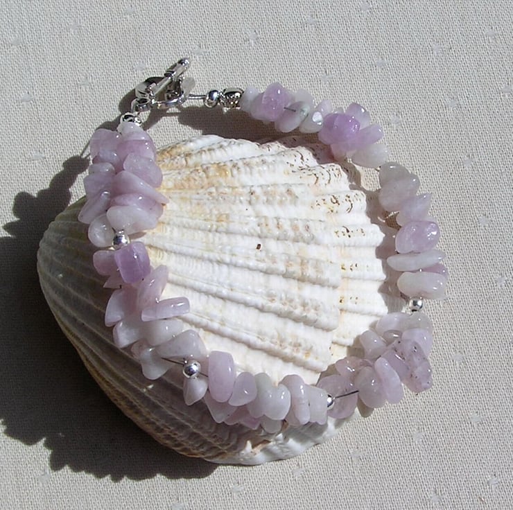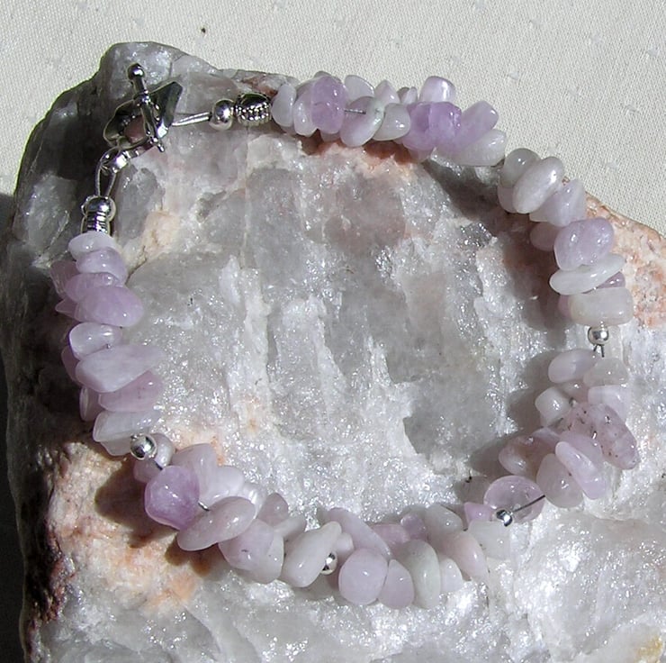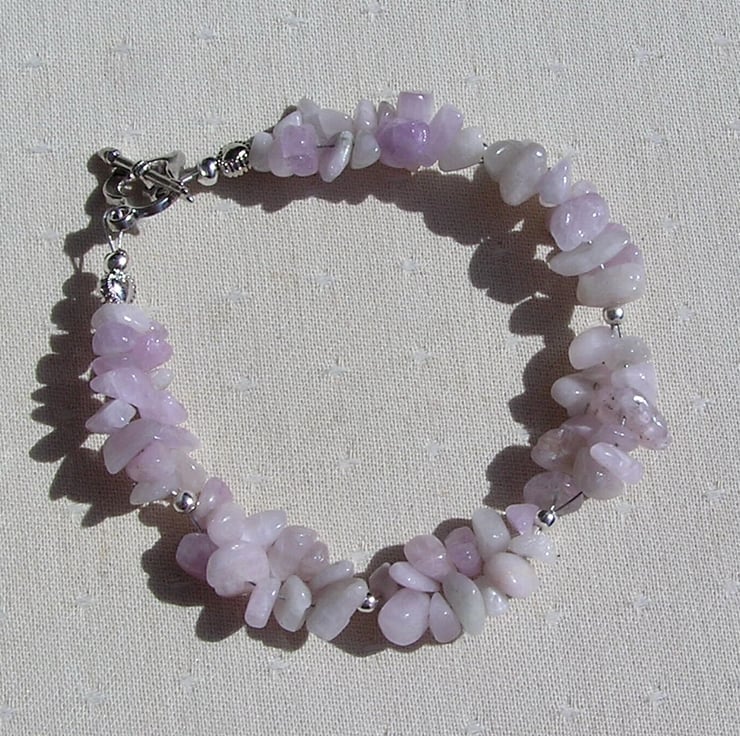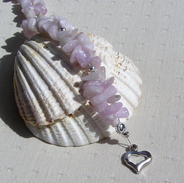 This Stunning Delicate Bracelet is made wholly from Kunzite – Double stranded Pale Lavender Gem chips separated into short sections by Silver spacer beads with a Silver Heart at each end - A Glistening combination