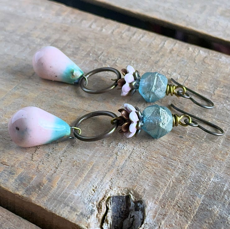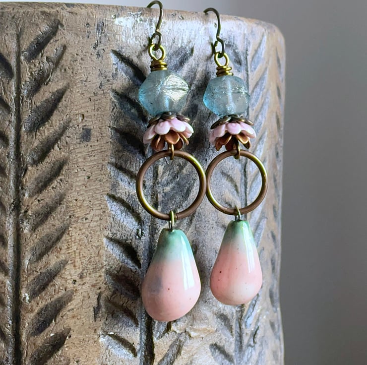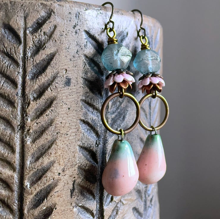 These bohemian-style earrings feature rustic ceramic drops handmade by bead artist Petra Carpreau. The hand-formed charms are beautifully glazed in a soft blush pink with hints of aqua.