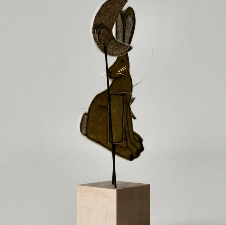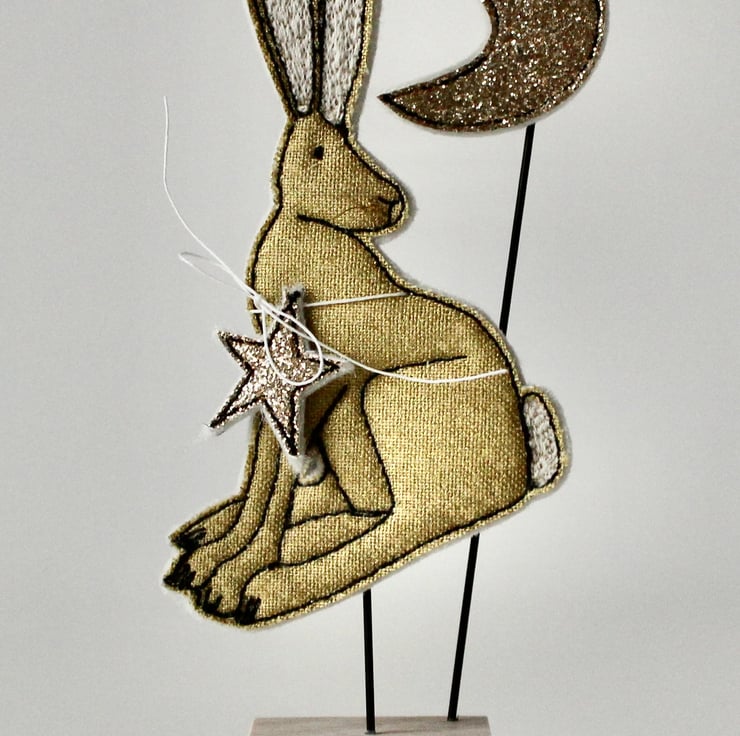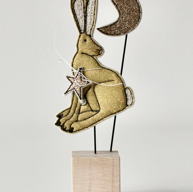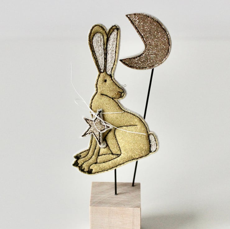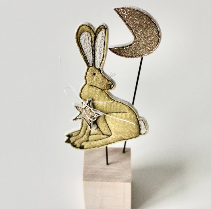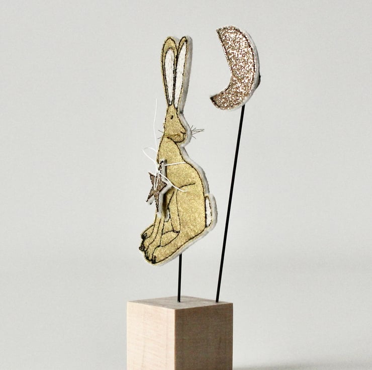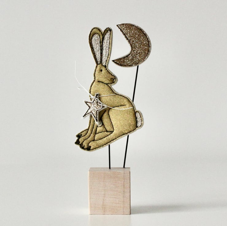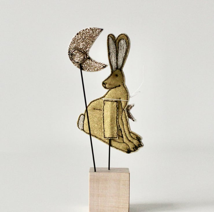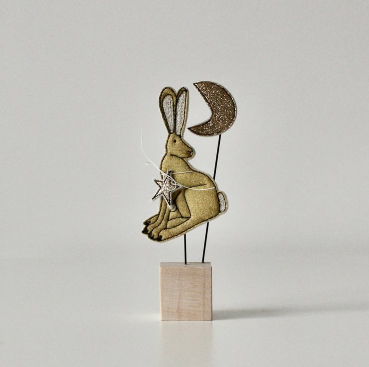 This hare, star and moon are sewn using gold cotton cloth, glitter cloth, 100% wool felt and free hand machine embroidery; multiple layers of cloth are sewn together and cut out by hand using sharp scissors. With golden thread whiskers and mounted on a 3cm cube wooden block which can adorn a mantle piece or any flat surface.