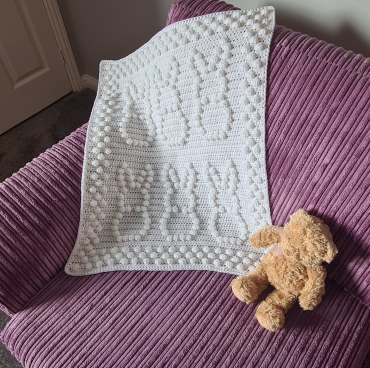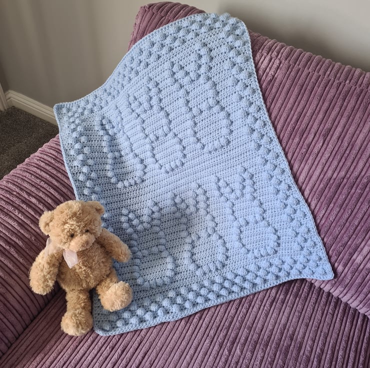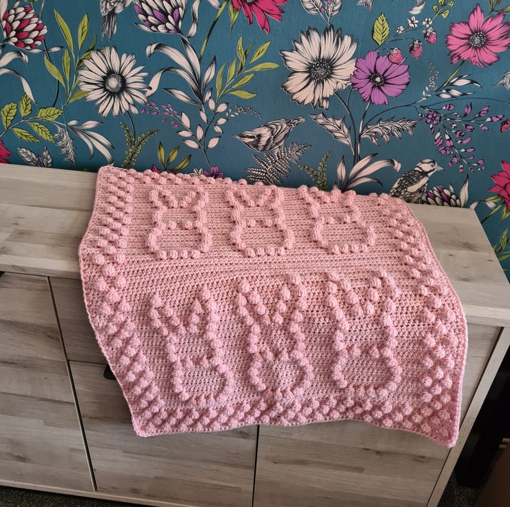 Beautiful handmade bobble crochet baby blanket, pushchair size with a lovely bunny design, made to order in your choice of colour