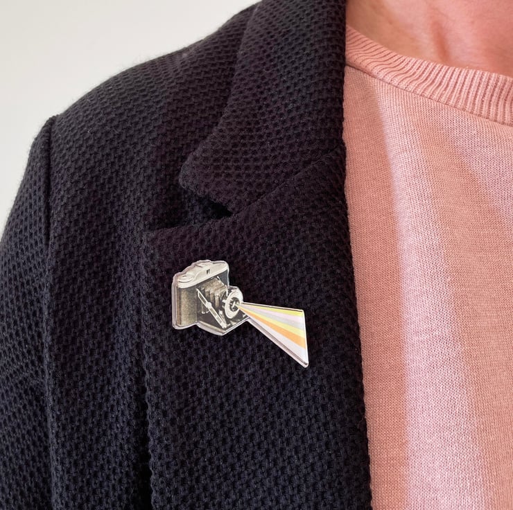 A retro brooch featuring a vintage camera design. Perfect for budding photographers.