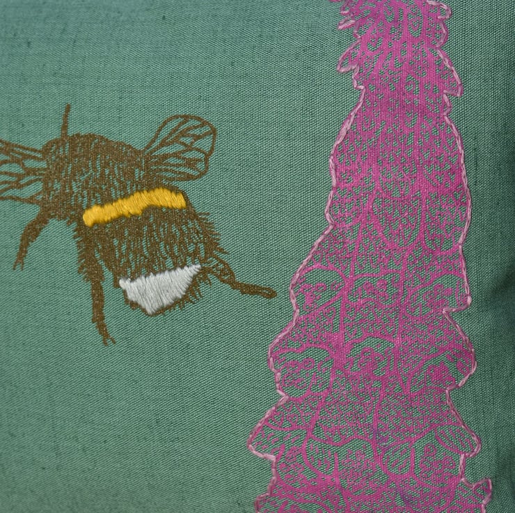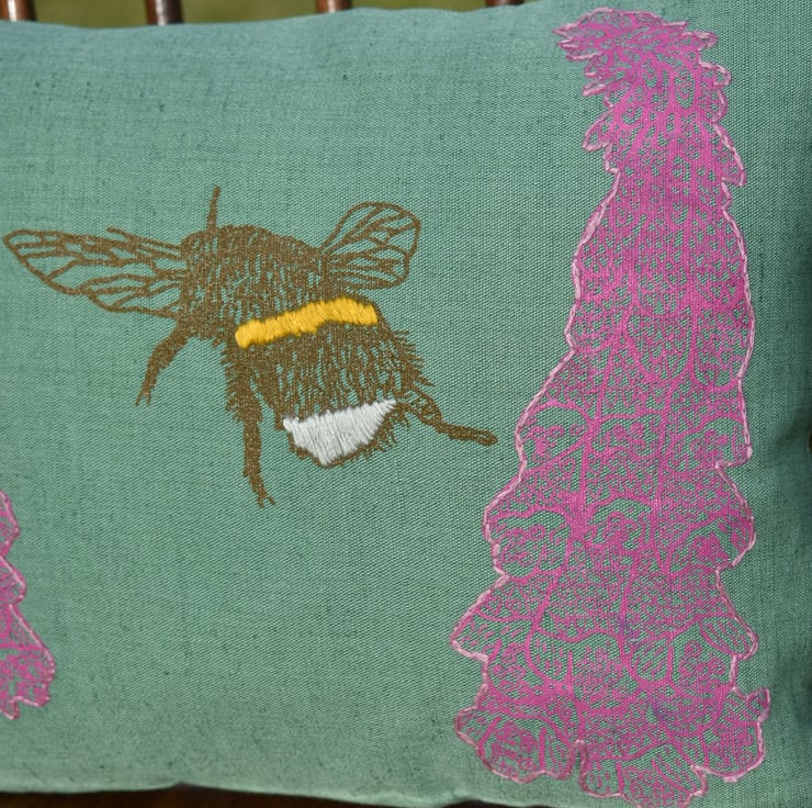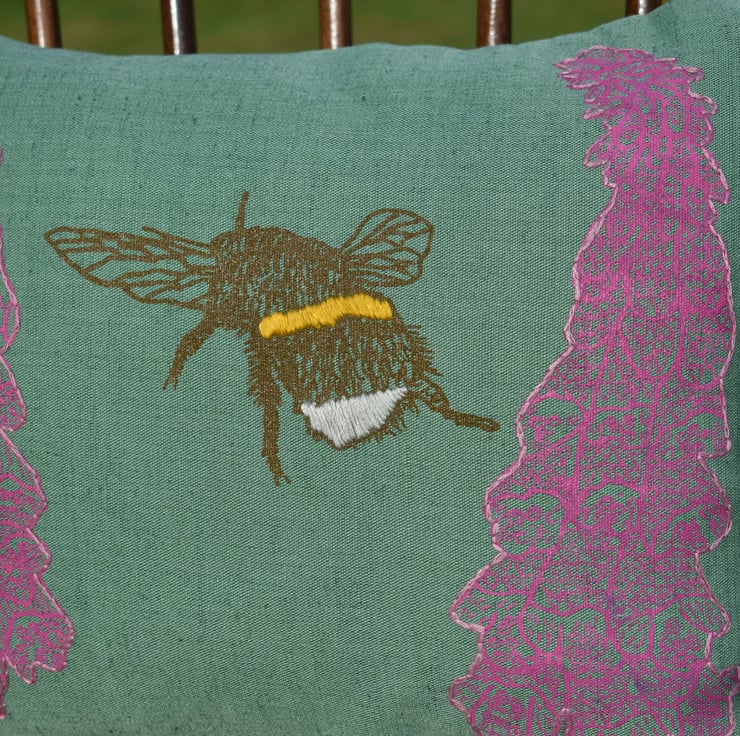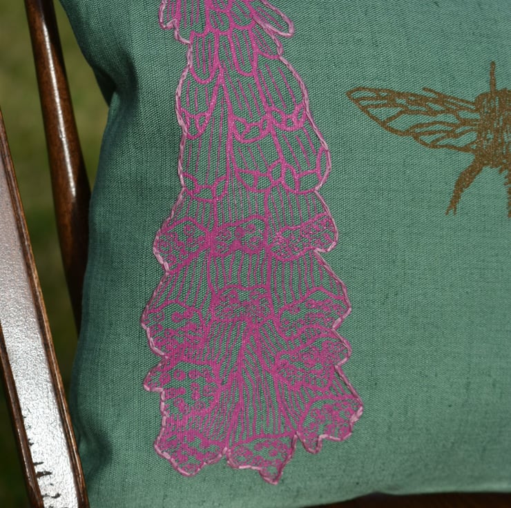 This is a green medium weight linen cushion that has been screen printed with my own designs. There are 2 foxgloves with different designs, hand embroidered to the edge, and a bee, with hand embroidered bands.