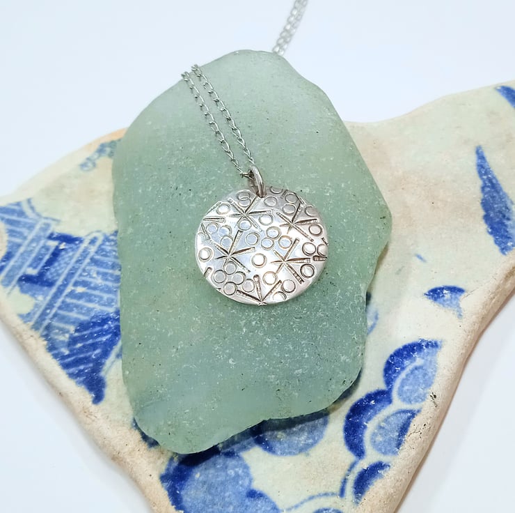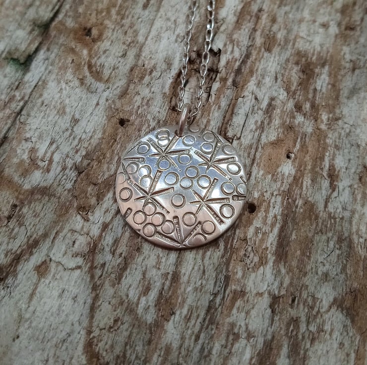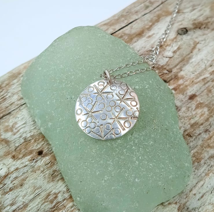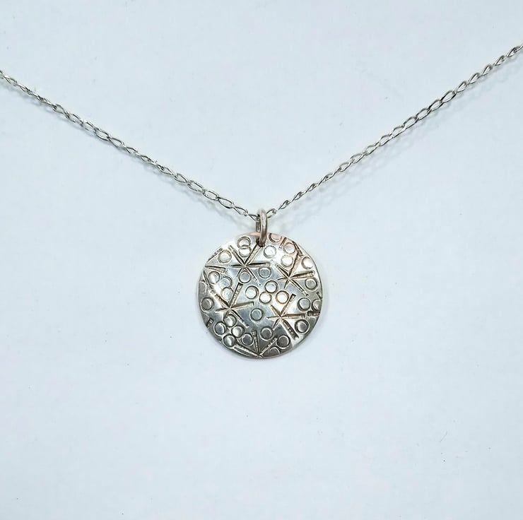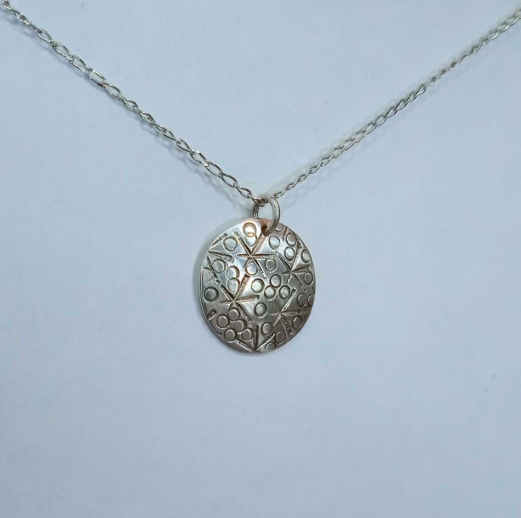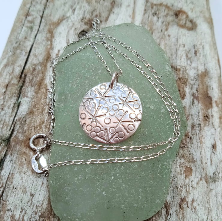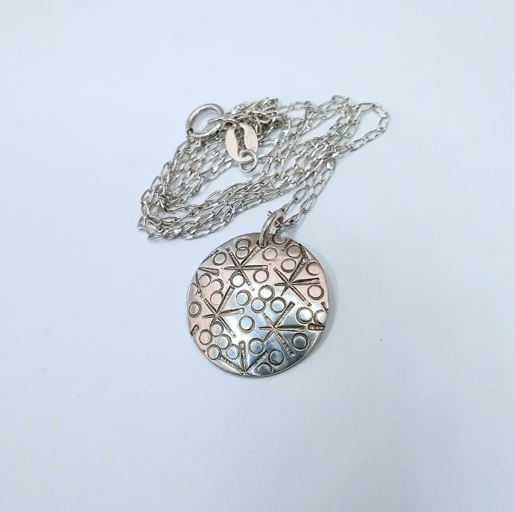 I have cut and finished the disc from 0.8 mm 100% recycled sterling silver before hand stamping a random star and small circle design. I have then slightly domed the pendant to create interest before polishing and then hanging it by a soldered sterling silver jump ring from an 18 inch sterling silver necklace which is also made of 100% recycled sterling silver.