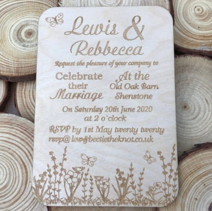 These beautiful bespoke wooden wedding invitations are made from 3mm Beech veneer and are engraved using a laser engraver. They are lightweight but strong and as they are made from 3mm ply they can easily be posted to your guests and can be kept by them as a lasting memento.