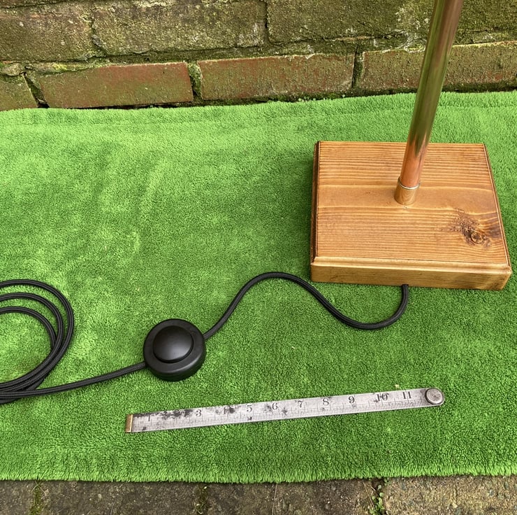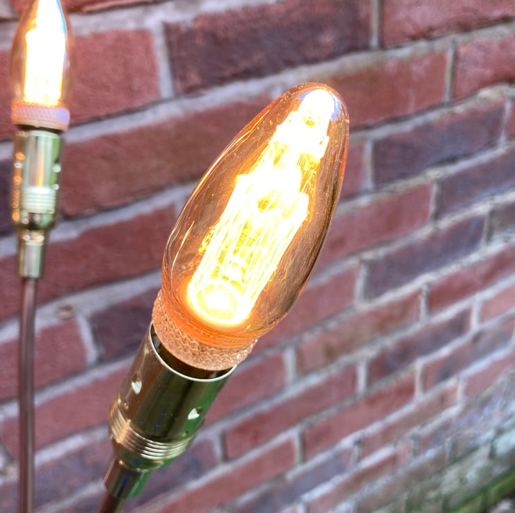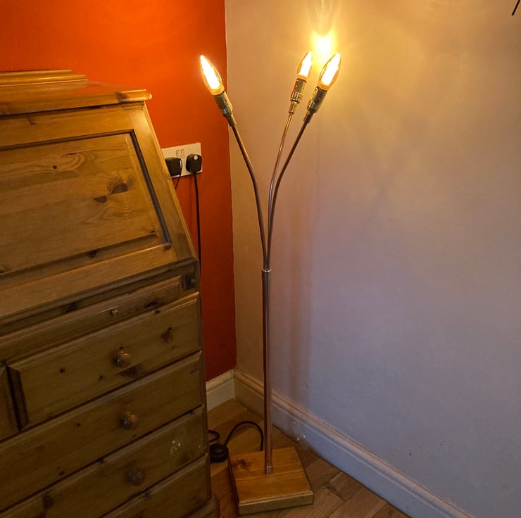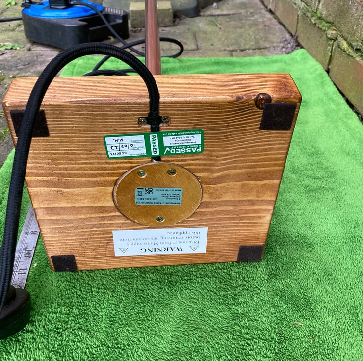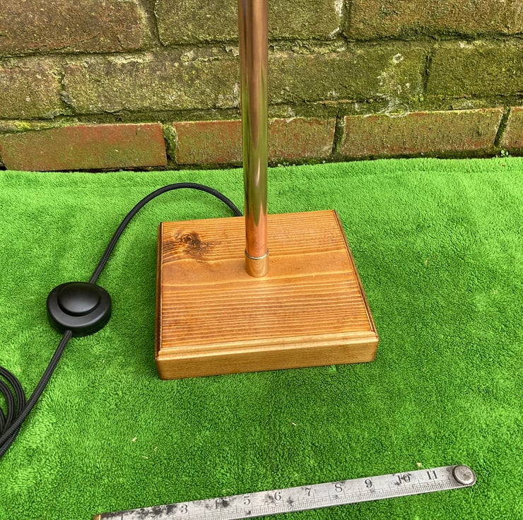 All electrical parts are brand new; over two metres of luxury black fabric braided flex supply the power, from a British Standard 3 amp fused plug, through a black inline foot switch to four brass plated SES lampholders fitted with four very economical 2-Watt squirrel cage candle LED bulbs, selected for their decorative warm light which reflects from the polished copper beautifully. The base is reclaimed floor joist, planed, sanded, stained to darken it and French polished to give it a beautiful, non-sticky, sheen.