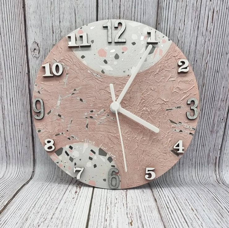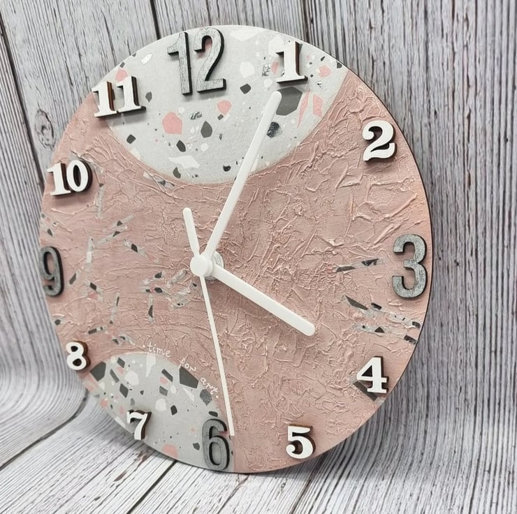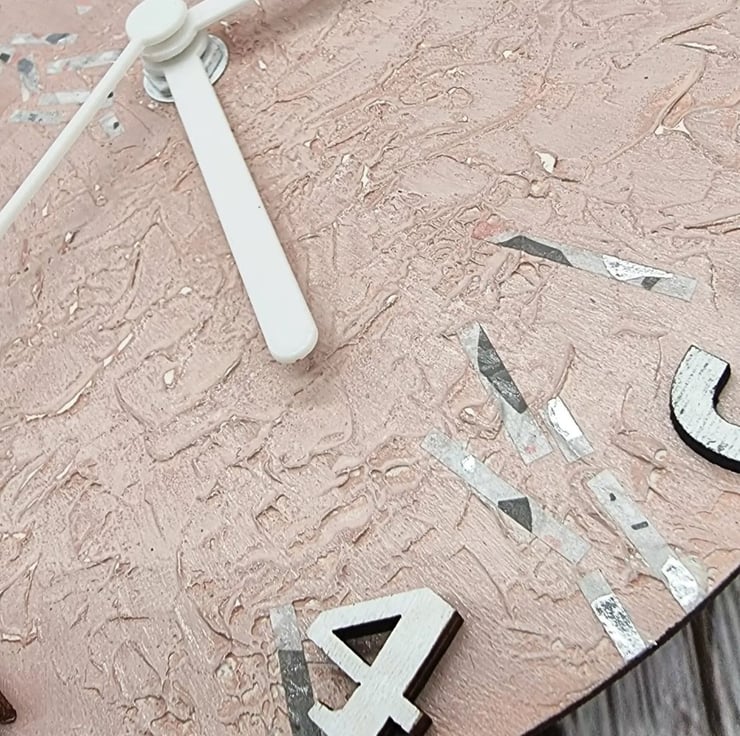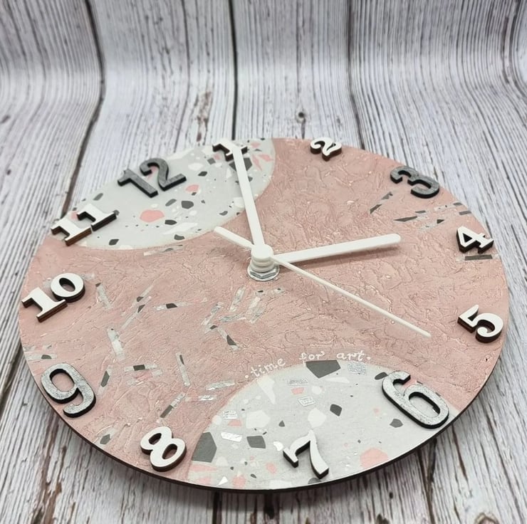 Used materials: plywood circle- diameter 20cm, clock mechanism, acrylic gesso, wooden numbers, texture paste, Crown paint, decopatch paper, decopatch glue varnish, acrylic pens, pouring medium, varnish spray.