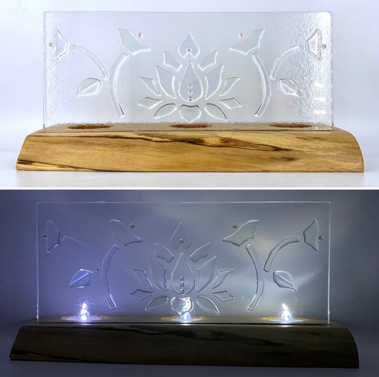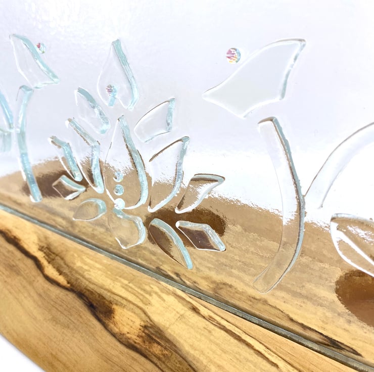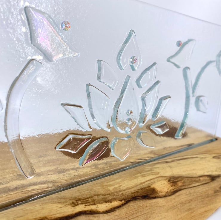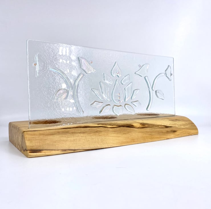 Subtle, yet effective, this pretty floral panel, inspired by a lotus flower, shows all the colours of the rainbow as it catches the light. Elements of dichroic glass which add an extra bit of sparkle to the piece.