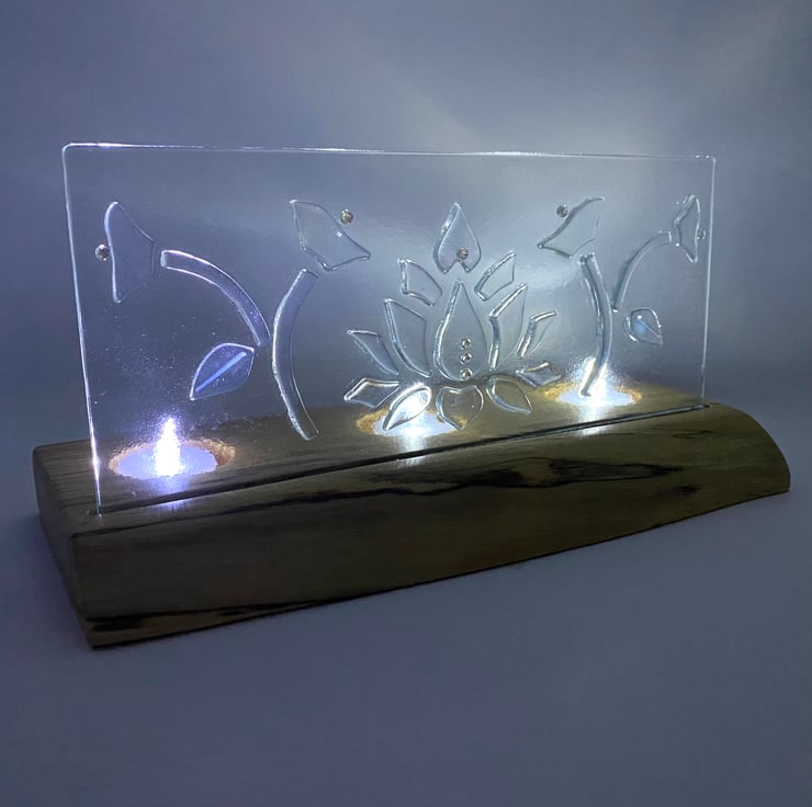 It sits in a gorgeous piece of spalted wood that houses 3 tea lights. The wood has been especially selected and finished with several coats of wax/oil to bring out the beauty of the grain and to give it a durable finish.