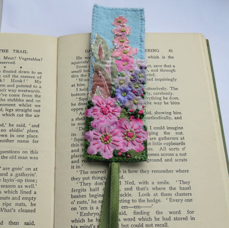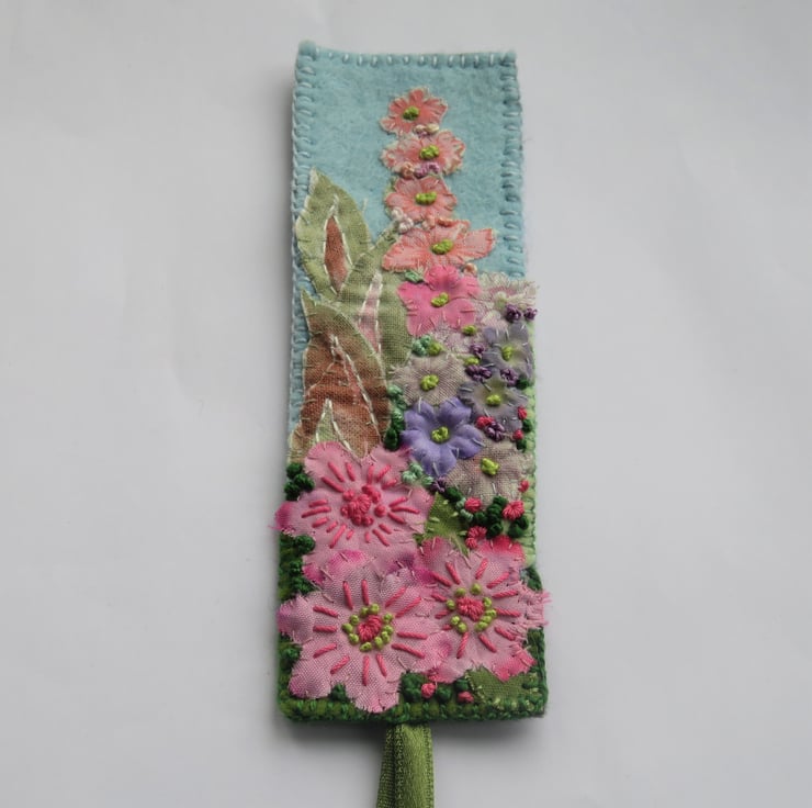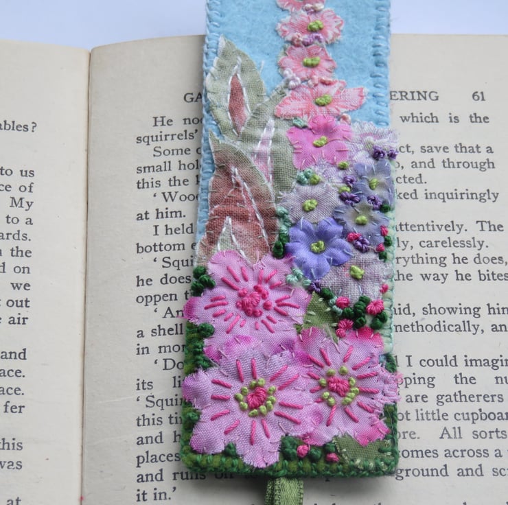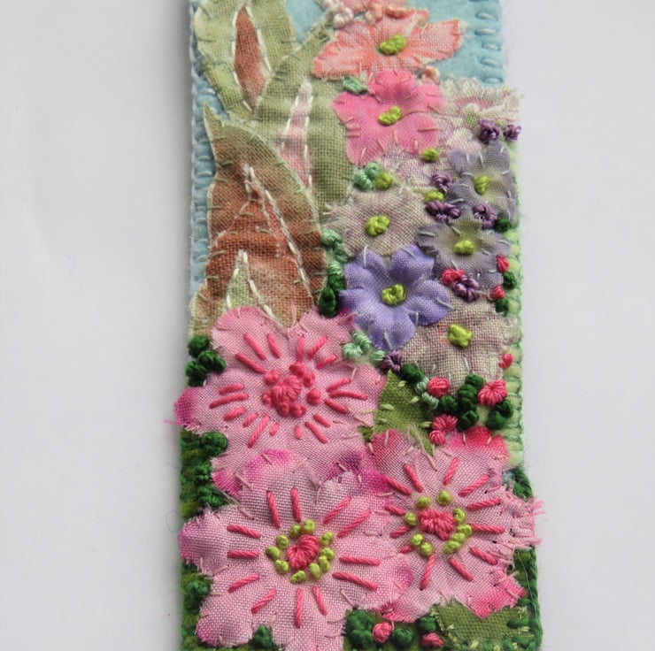 A profusion of pink and lilac coloured flowers decorate this pretty bookmark felt bookmark. A lover gift for a book lover!