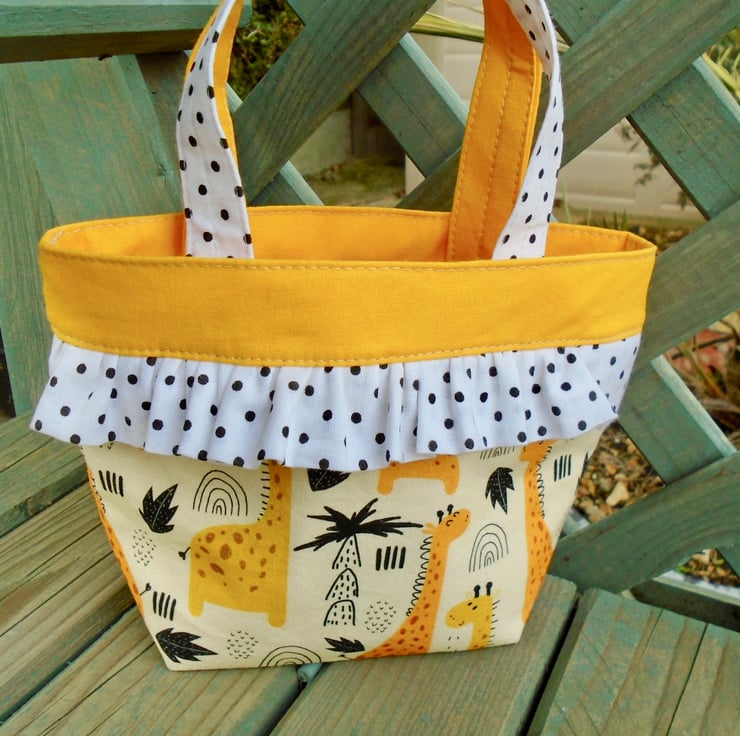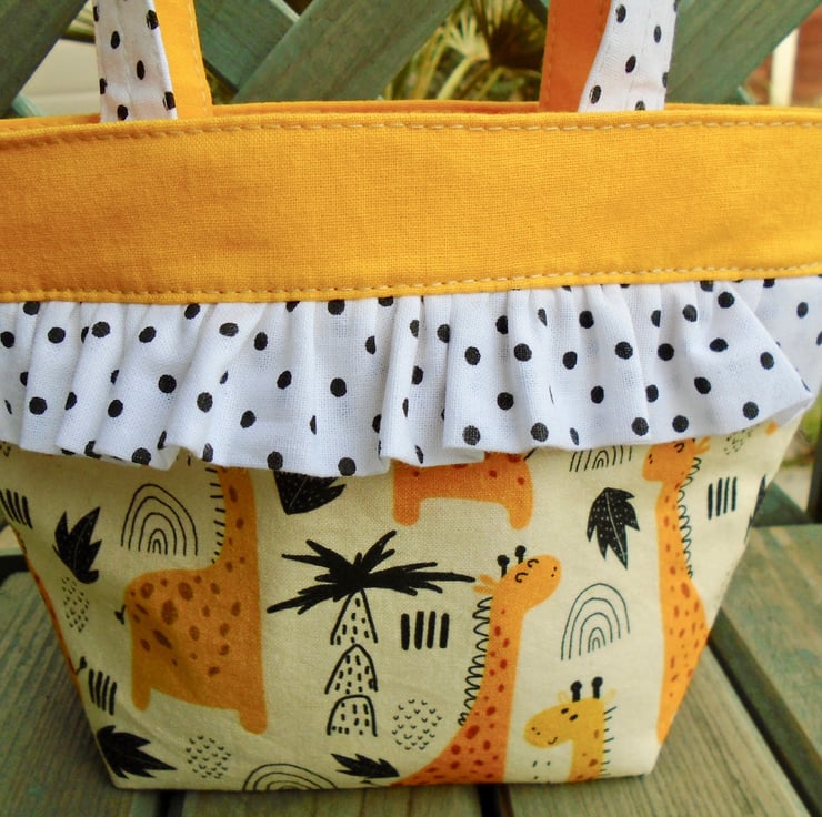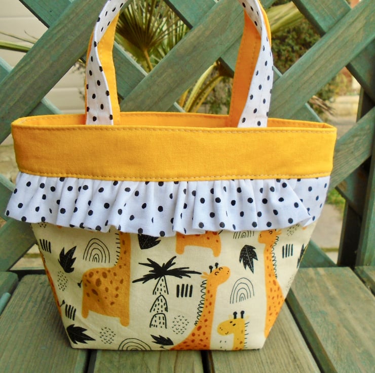 Made in a lovely printed giraffe cotton fabric . Front has a pretty ruffle in a white / black polkadot cotton fabric .