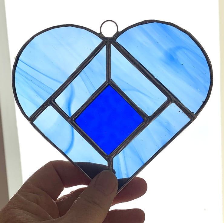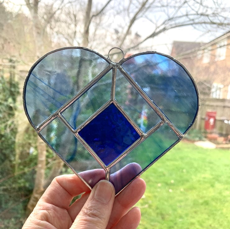 Each piece of glass has been cut by hand, ground, washed, foiled and then soldered with a generous beading on the joints for added strength, I have left the solder silver. A ring has been attached for hanging purposes.