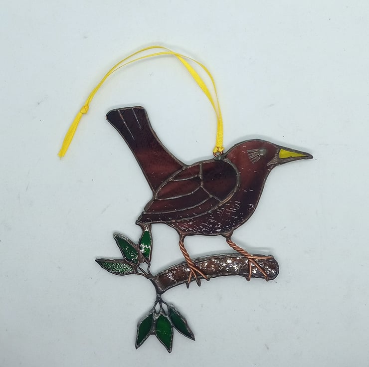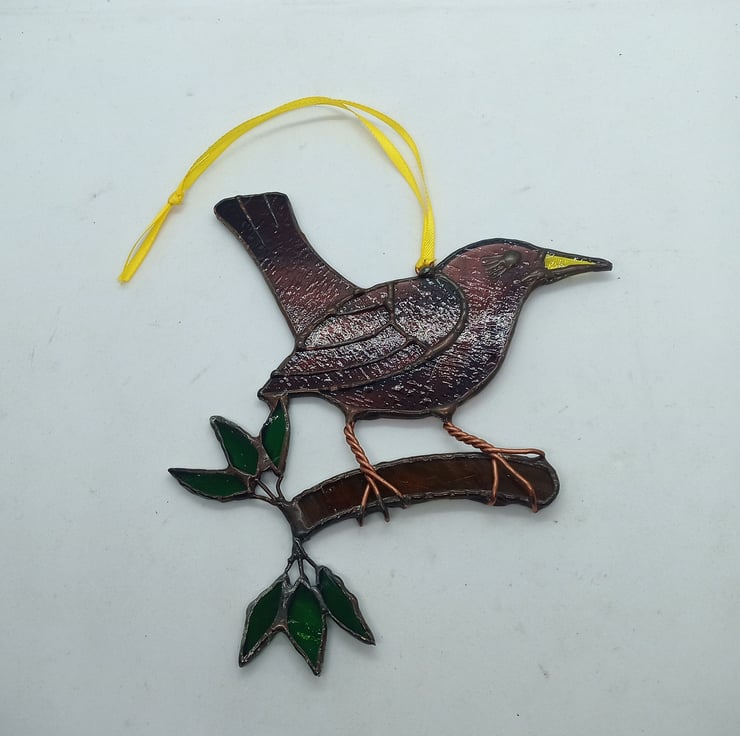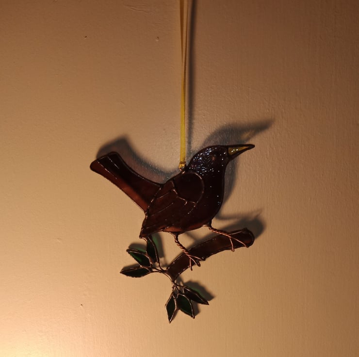 A beautiful black (or rather purple) bird created from streaked purple, yellow, brown and green glass.