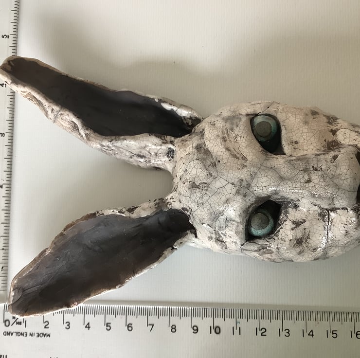 Raku fired hare head with white crackle and turquoise eyes. Formed by pinching the clay and sculpting by hand. I make all my creations from home and enjoy raku firing at a local studio. Dimensions shown in the photos.
