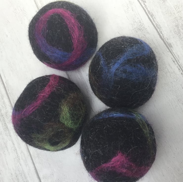 I love making these and I hope you enjoy using them. These tumble dryer balls are 100% pure wool, made from a combination of raw fleece, waste wool and yarn, felted together to make a firm ball. They will not unravel, as the process makes a secure finished product. This set reminds me of the Northern Lights - hence the name. They are supplied in a handy drawstring bag. Choose a set of 3 or 4 balls – 3 does a good job, 4 is even better!