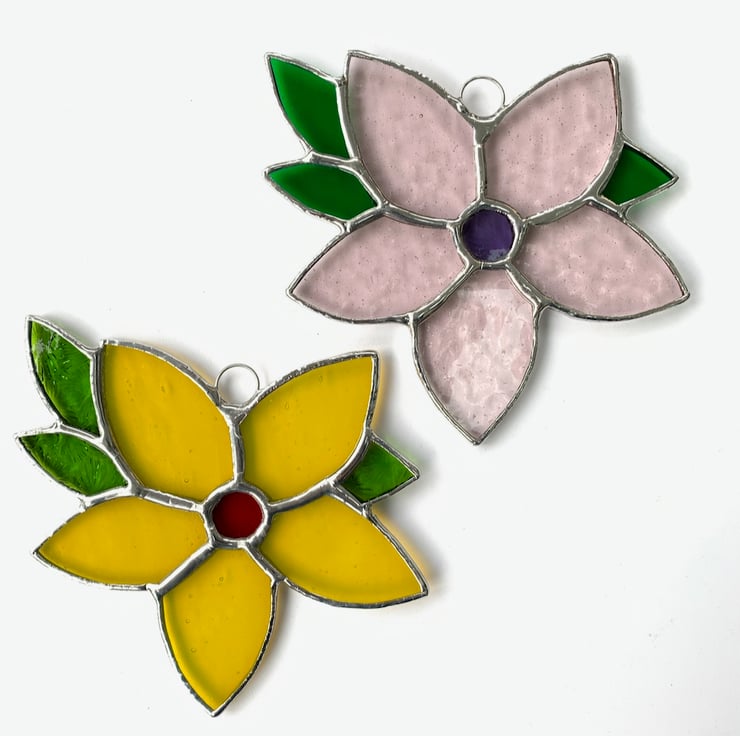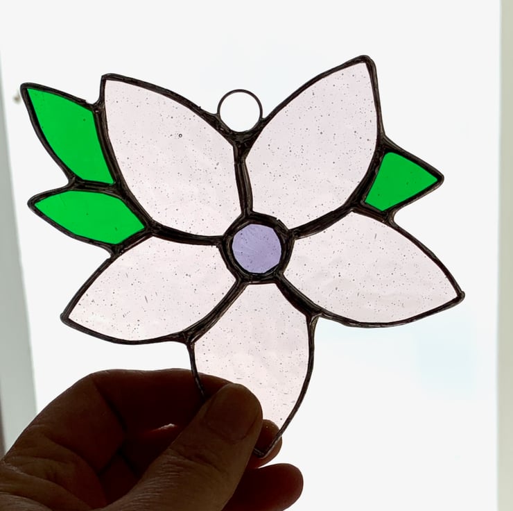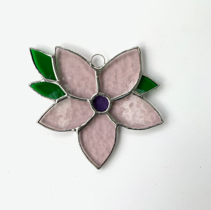 The glass used for this piece is pink corella glass for the petals, mauve florentine glass for the centre and green wissmach glass for the leaves.