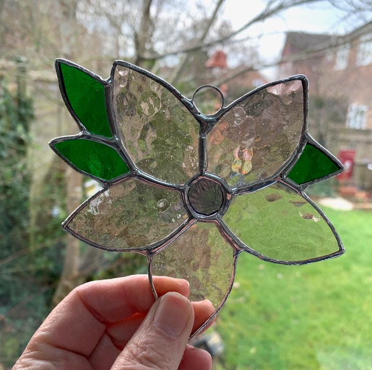 Each piece of glass has been cut by hand, ground, washed, foiled and soldered together before being washed again and polished. I have attached a small ring and length of fishing line for hanging purposes.
