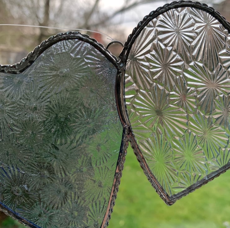 Each piece of glass has been cut by hand, ground, washed, foiled and solder together. I have attached a twisted wire surround which is not only attractive but also gives the piece added strength. A small ring has been attached and a length of fishing line for hanging purposes.