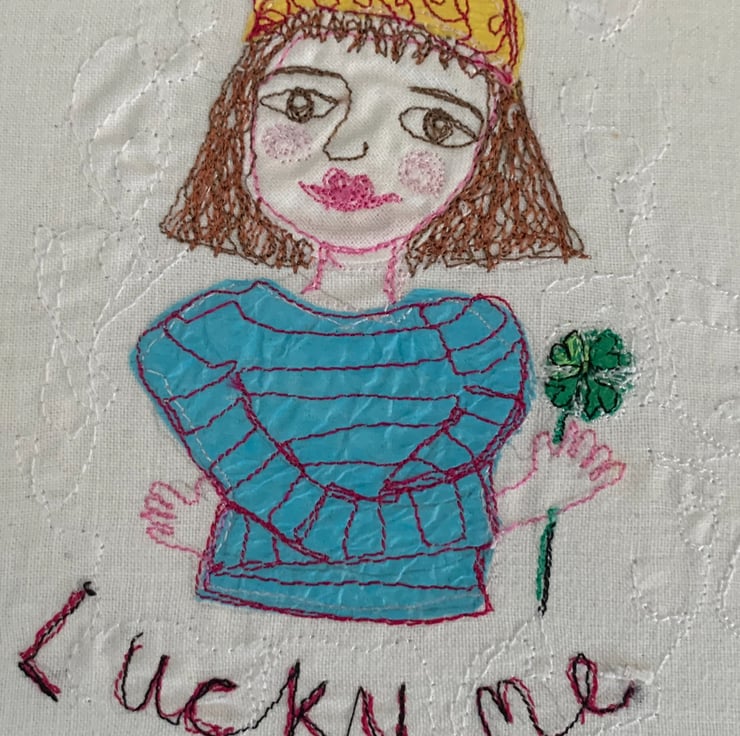 As well as printmaking being one of my passions I love textile art. Particularly freestyle embroidery. I like naive style art and illustration and wanted to make a doodle with stitching. Letting the sewing machine move across the fabric, a bit like drawing with a pen and not lifting the pen from the surface.