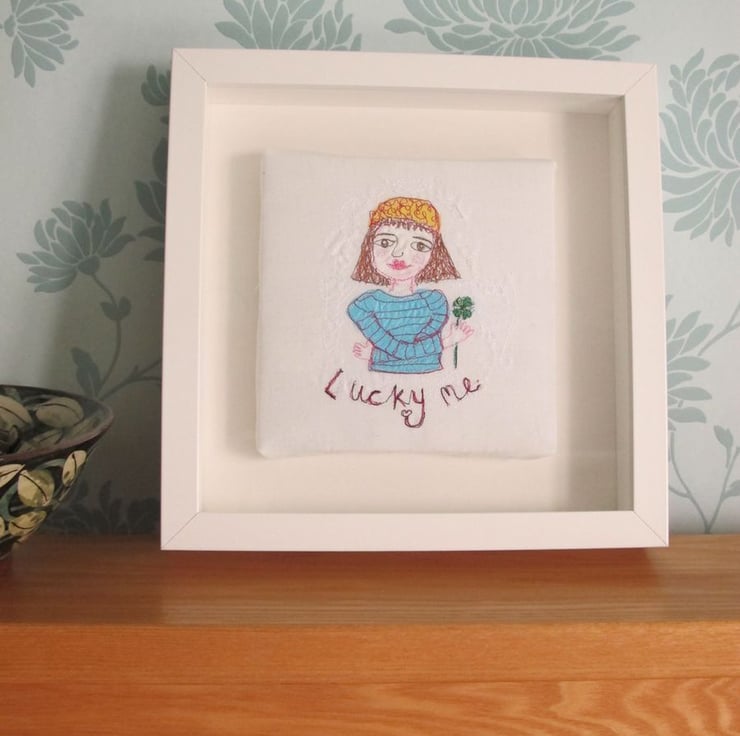 Free style embroidery of a girl holding a lucky Shamrock. This little picture can be hung with a little loop at the back. I have also displayed in an IKEA RIBBA Box frame (NOT INCLUDED)